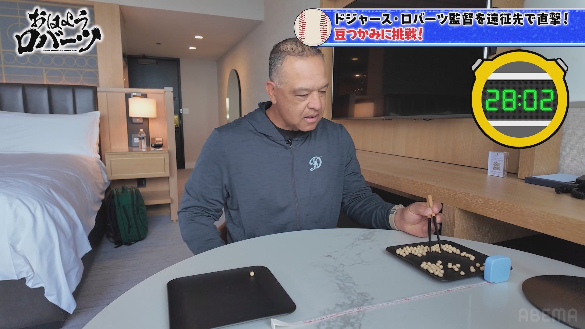 制限時間30秒の中で、30センチの間隔があいた皿へ箸で豆をつかみ、移すゲームに挑戦してもらうと、箸で上手に豆をキャッチするロバーツ監督の姿が。しかし、「やってしまった…」とつぶやくと、惜しくも箸から豆がこぼれ落ちていきました。ロバーツ監督は「もう1回!」と第2試合を懇願。そして、見事6つの豆を箸で運ぶことに成功。ロバーツ監督は「箸をつかえるのは素晴らしい。才能がいるな…」と語り、楽しそうな様子でした。