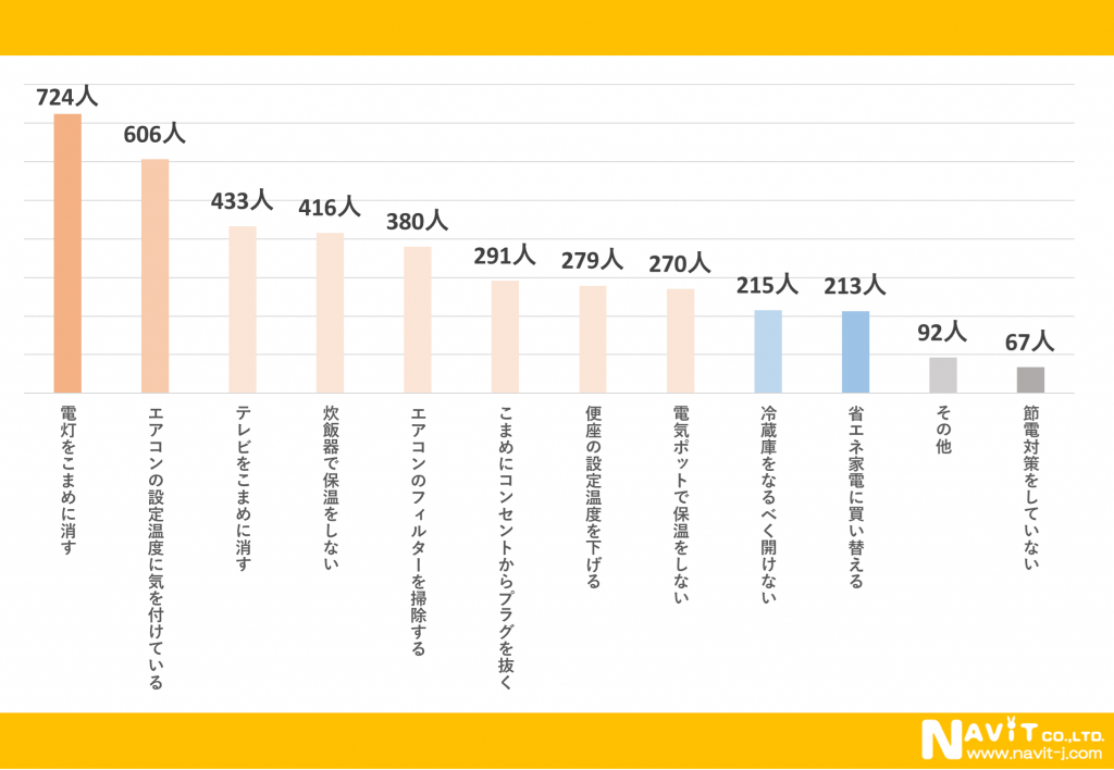 こちらは複数回答でのアンケートになります。節電対策で1番多かったのは「電灯をこまめに消す」で724人です。次に多かったのは「エアコンの設定温度に気をつけている」が606人となっています。3番目は「炊飯器で保温をしない」が416人という結果になりました。身の回りのもので細かく節電をしているようですね。