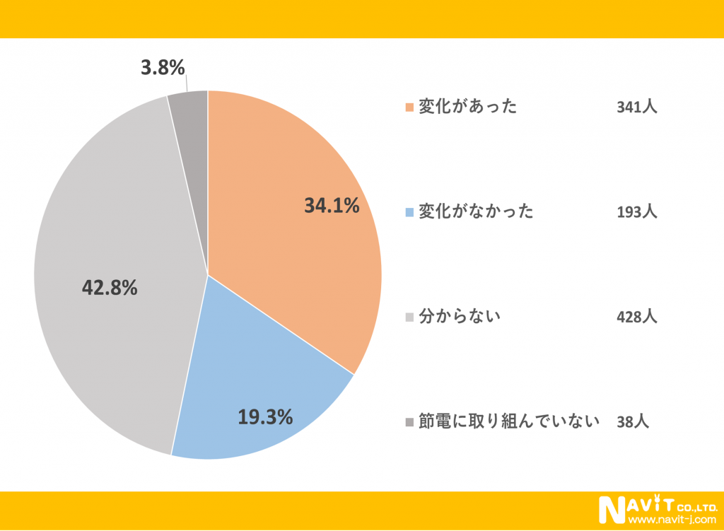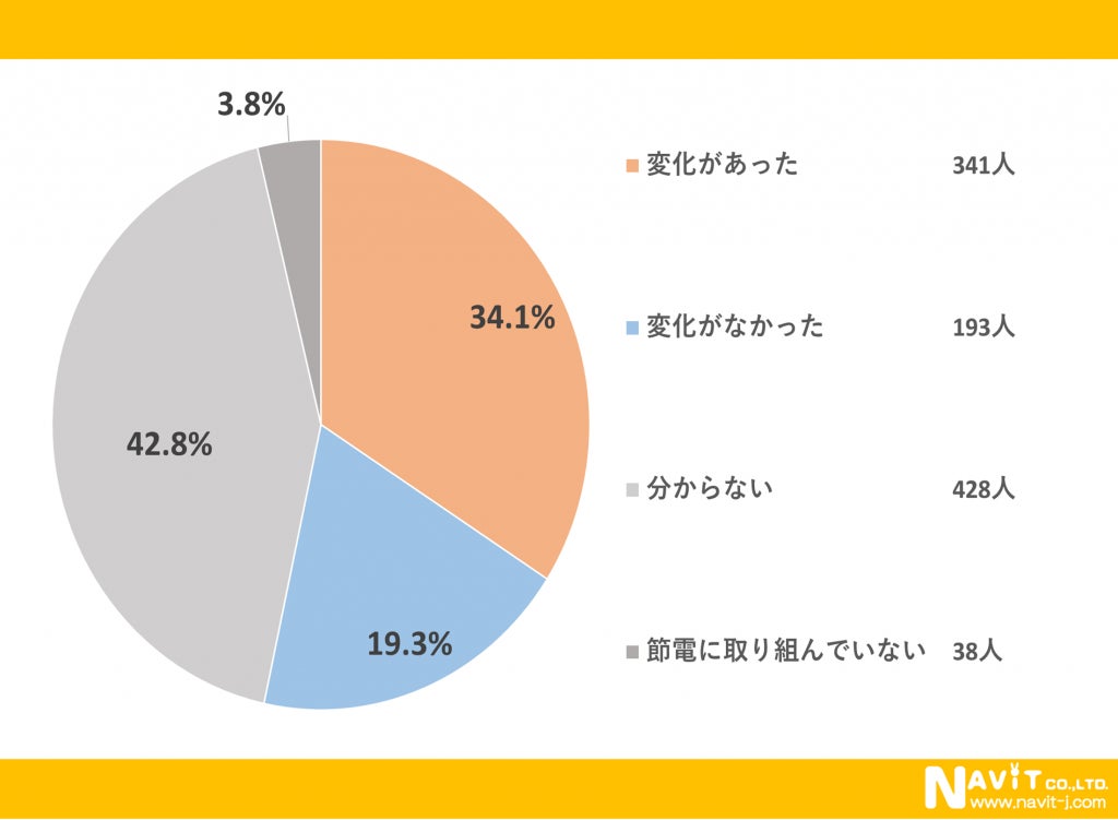 節電に取り組んで電気料金の変化についてのアンケートでは「変化があった」という方が34.1%で「分からない」と回答された人より8.7%下回る結果となりました。現在は節電家電が多いので、変化は小さいのでしょうか。