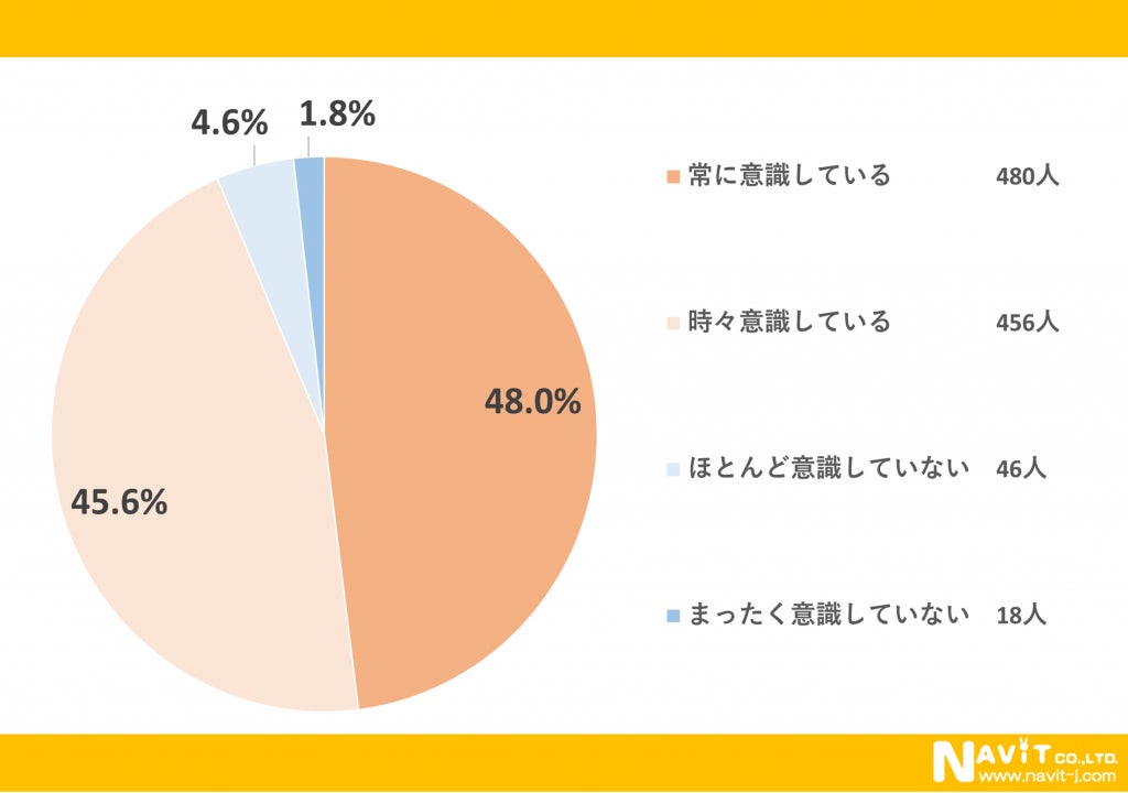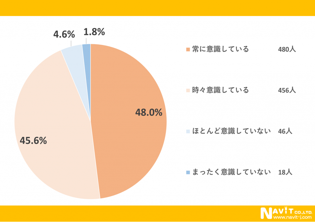 節電への意識についてのアンケートでは節電を「常に意識している」と回答された人が48.0%で「時々意識している」と回答された人が45.6%いらっしゃいます。合計すると93.6%の人が節電を意識して生活していることがわかります。