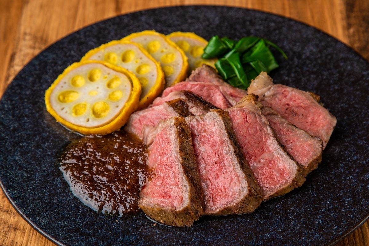 熊本・阿蘇の雄大な自然の中で育った希少な和牛‘あか牛‘サーロインに近いロースの部位を使用しており、赤身のヘルシーさと和牛のうま味を兼ね備えたステーキに熊本ならではの清酒・調味料である赤酒を使ったさっぱりソースを合わせました。