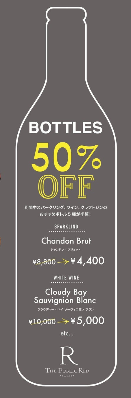 期間中、スパークリングやワイン、クラフトジンなど5種のおススメボトルが半額でご利用いただけます。