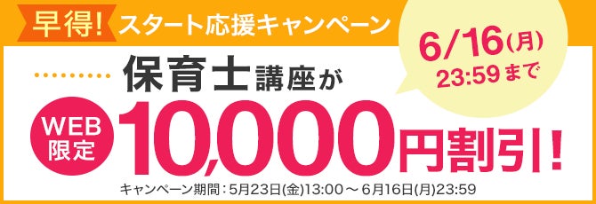株式会社ユーキャンでは、5月23日(金)より「早得!スタート応援キャンペーン」を開始しました。6月16日(月)まで、WEBからの受講お申込み限定で保育士講座の受講料を10,000円割引いたします。
