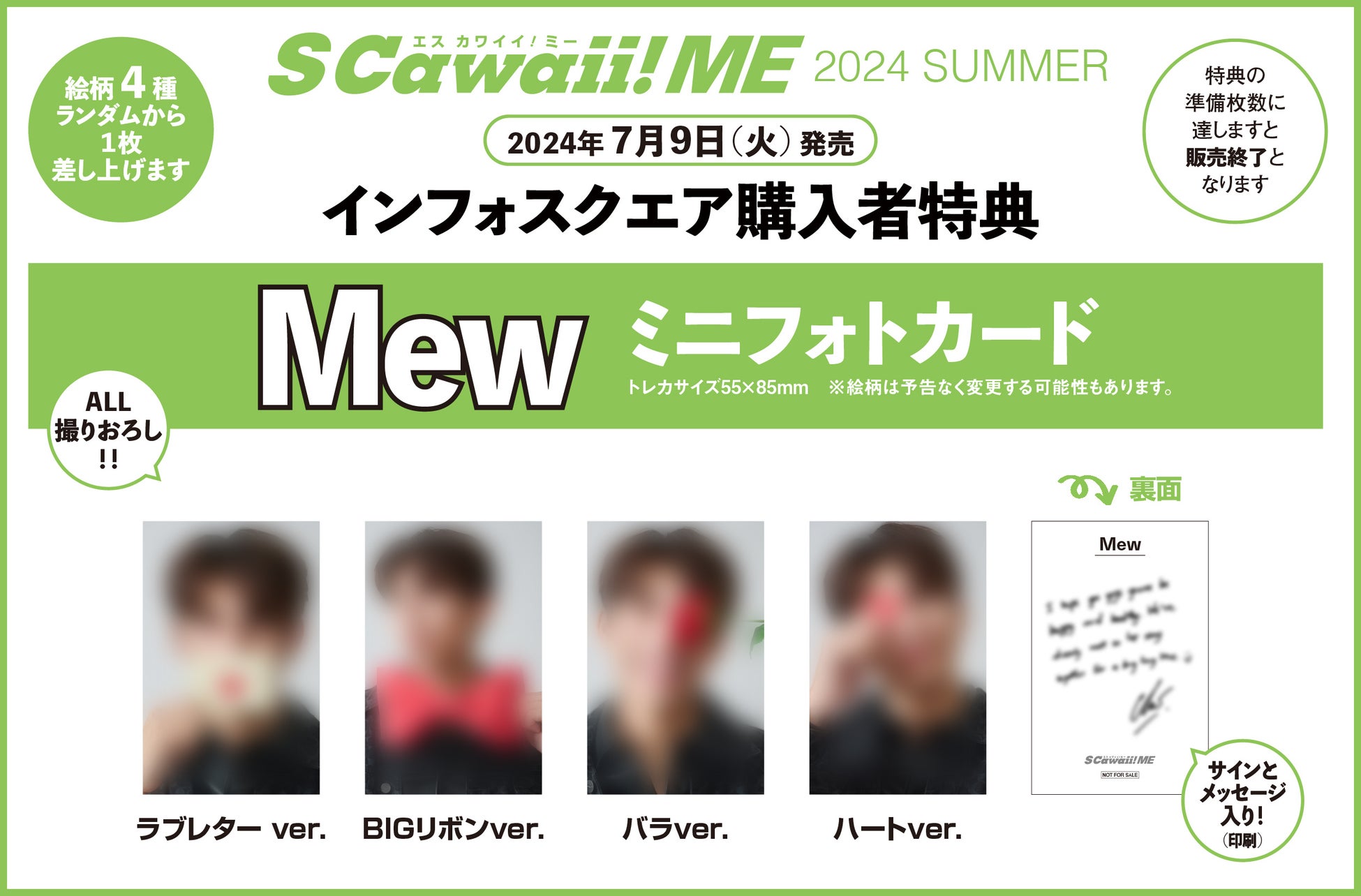 下記URLから『S Cawaii! ME 2024 SUMMER』をお求めいただくと、Mewさんのミニフォトカードを4種からランダムで1枚差し上げます。
