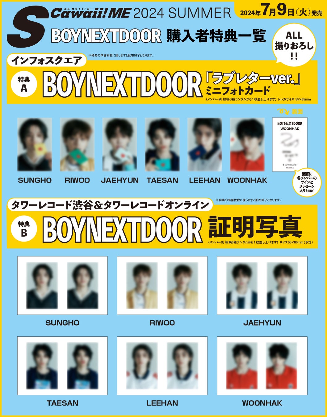 下記URLから『S Cawaii! ME 2024 SUMMER』をお求めいただくと、BOYNEXTDOORの購入者特典を6種からランダムで1枚差し上げます。