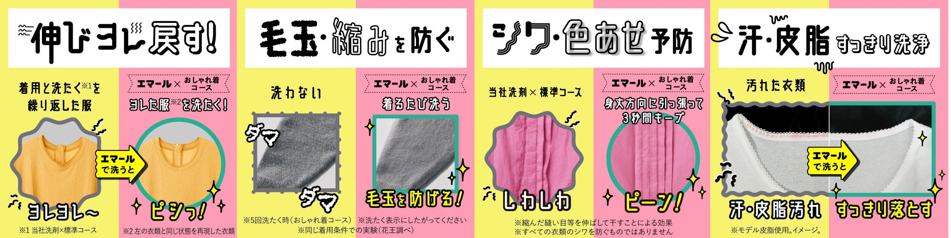 お気に入りの服を大事に長く着たいのに、着用回数が多くなるほど伸びやヨレといったダメージが気になるという声におこたえし、「エマール」は独自のカタチコントロール技術に加えて、新たに『ダメージリペア技術』を搭載。センイを内側から補修して伸びやヨレを戻して、きれいなシルエットを復活させます。
