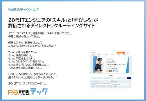「Re就活テック」は、20代ITエンジニアの「スキル」と「伸びしろ」が評価されるダイレクトリクルーティングサイトです。