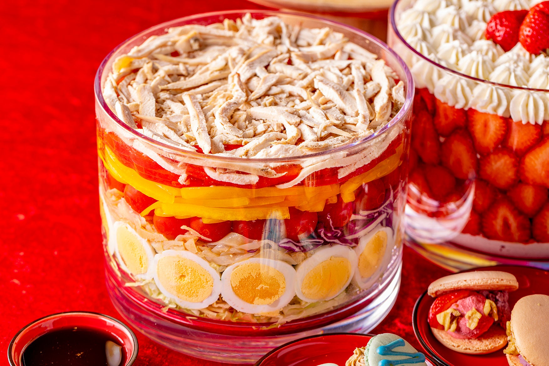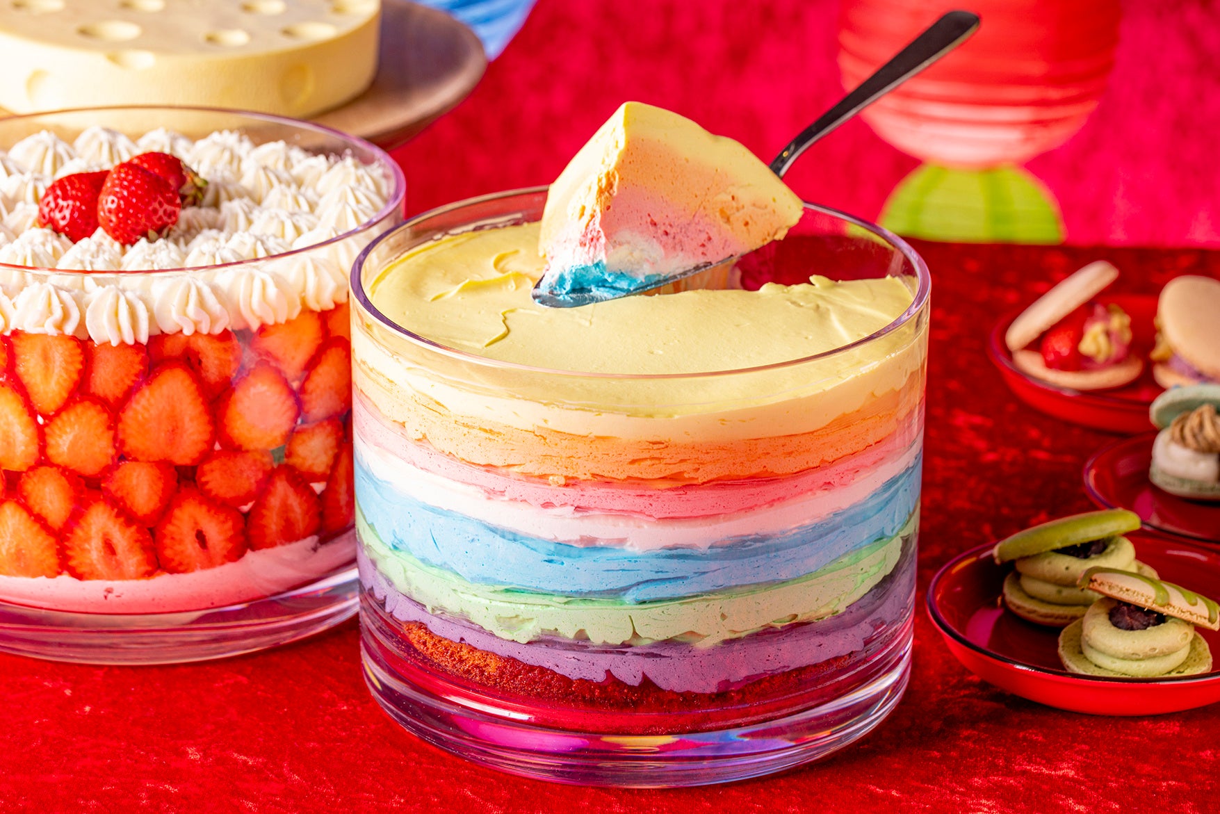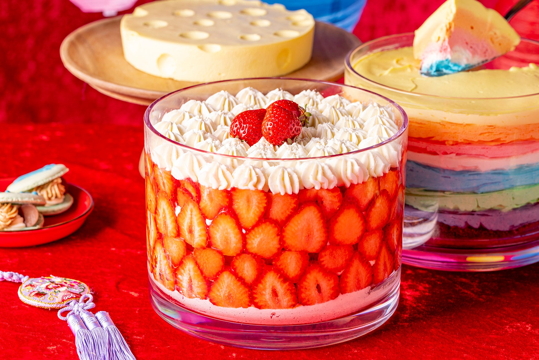 直径20センチのグラスに隙間なく並べた、韓国語で“いちご”を意味するいちごを贅沢に使った「タルギケーキ」や、7色のカラフルなクリームの層を重ねた「レインボーティラミス」、たくさんの具材を積み上げた「チキンサラダ」など、見た目も楽しめるメニューをご用意しております。