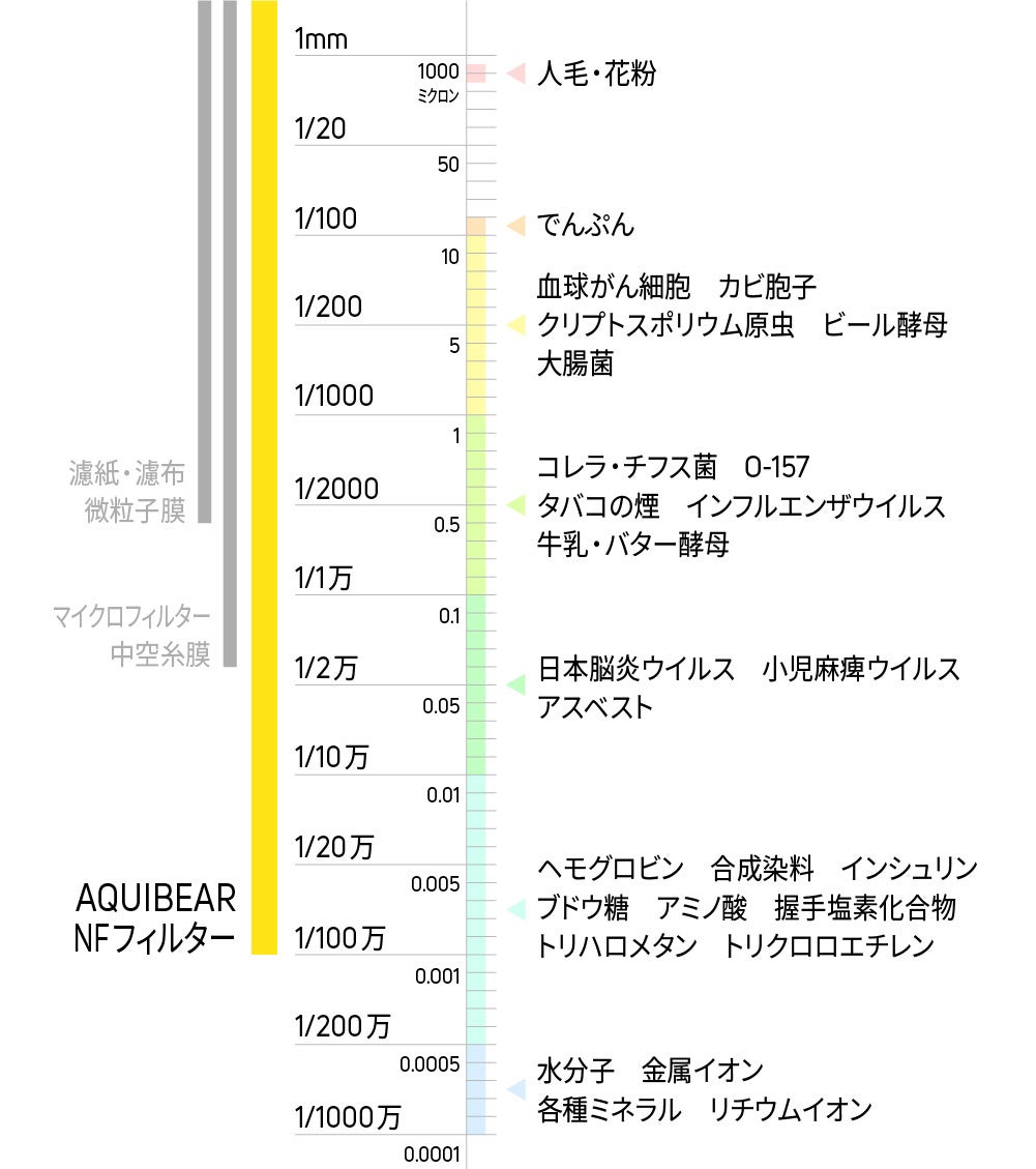 しかし、Aquibearで利用するNFフィルターは濾過性能にこだわり、必要なミネラルを残しながらも、その他の不純物を濾過します。