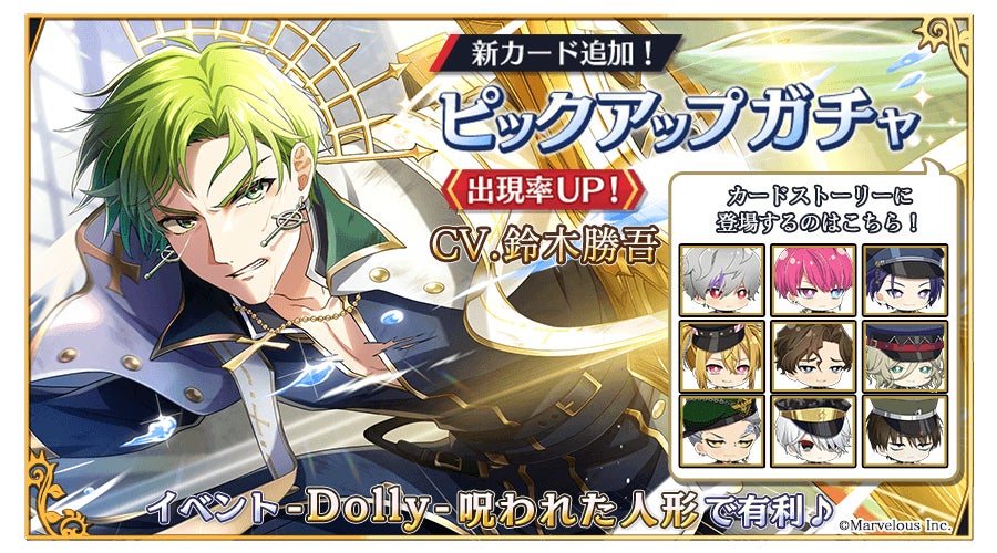 株式会社マーベラス(代表取締役社長:佐藤 澄宣/所在地:東京都品川区)による、スマートフォンゲーム『千銃士:Rhodoknight』(読み:せんじゅうし ろーどないと 以降、『千銃士R』)は、10月7日より開催中のイベント「Dolly-呪われた人形-」にあわせて、イベント内で活躍する★3「【鮮緑の退魔士】エンフィールド(CV:鈴木勝吾)」の新カードがピックアップで登場する期間限定ガチャを開催いたします。