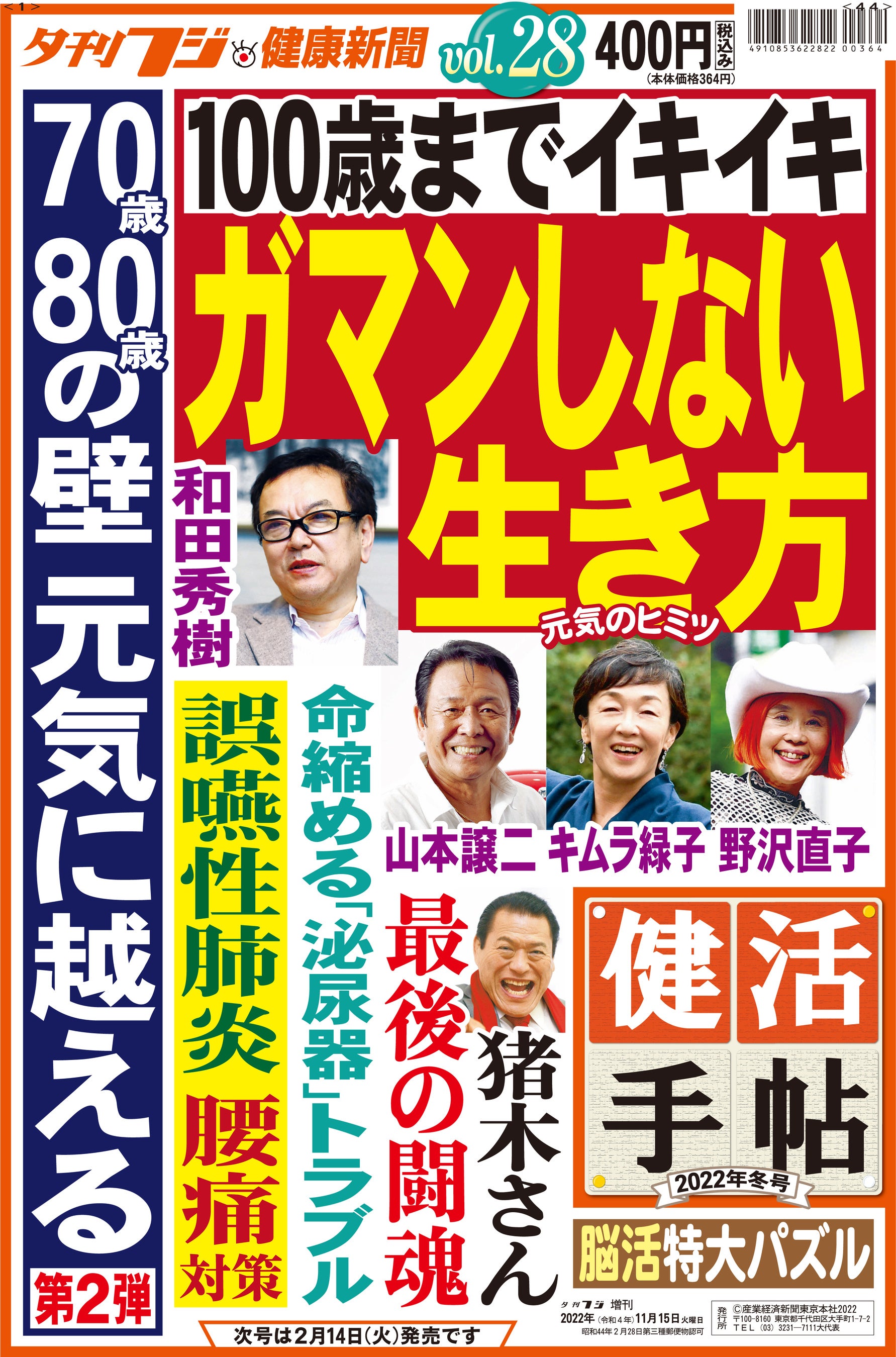 ワイド特集「100歳までイキイキ 元気で越える 70歳の谷 80歳の壁」第2弾では、誤嚥(ごえん)性肺炎や腰痛対策、夜間頻尿など、各分野の専門医に徹底取材しました。健康長寿本でベストセラーを続ける、和田秀樹医師の『「ガマンしない」生き方』は、読むだけで元気が出ます。山本譲二さん、キムラ緑子さん、野沢直子さんのインタビューや、難病と闘い続けたアントニオ猪木さんの「最後の闘魂」など、読み応えたっぷりです。第29号は、2023年2月14日(火)発行の予定です。