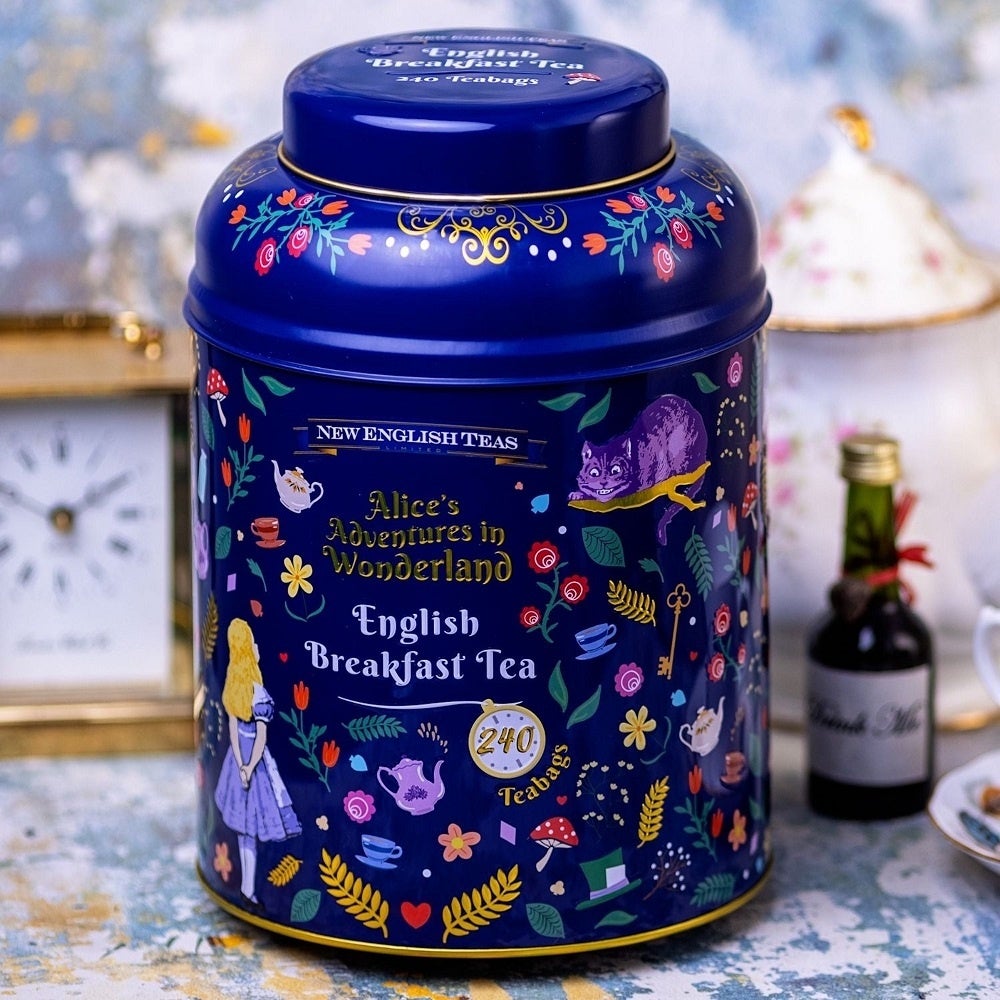 不思議の国のアリスの世界がデザインされた紅茶缶。