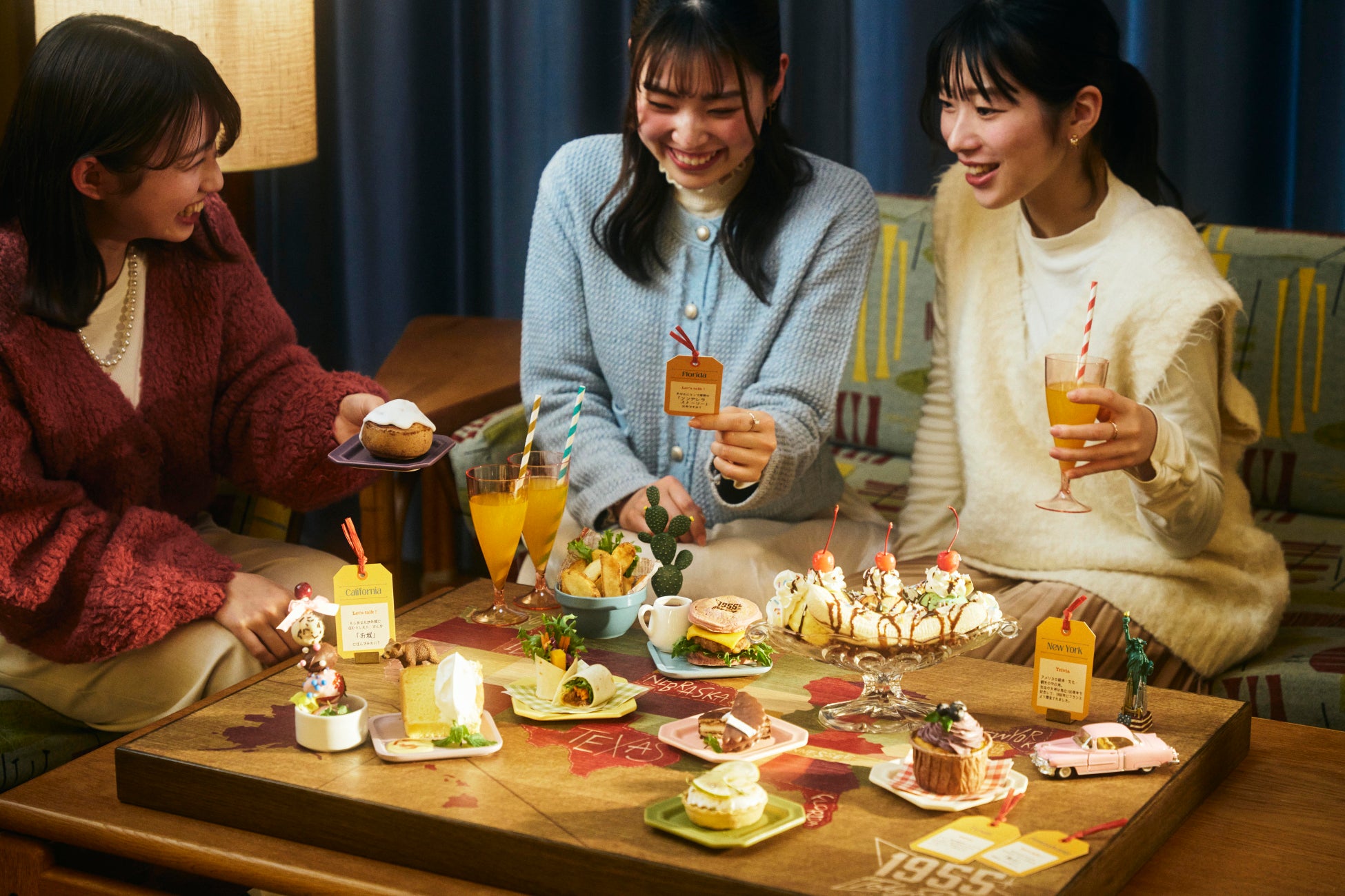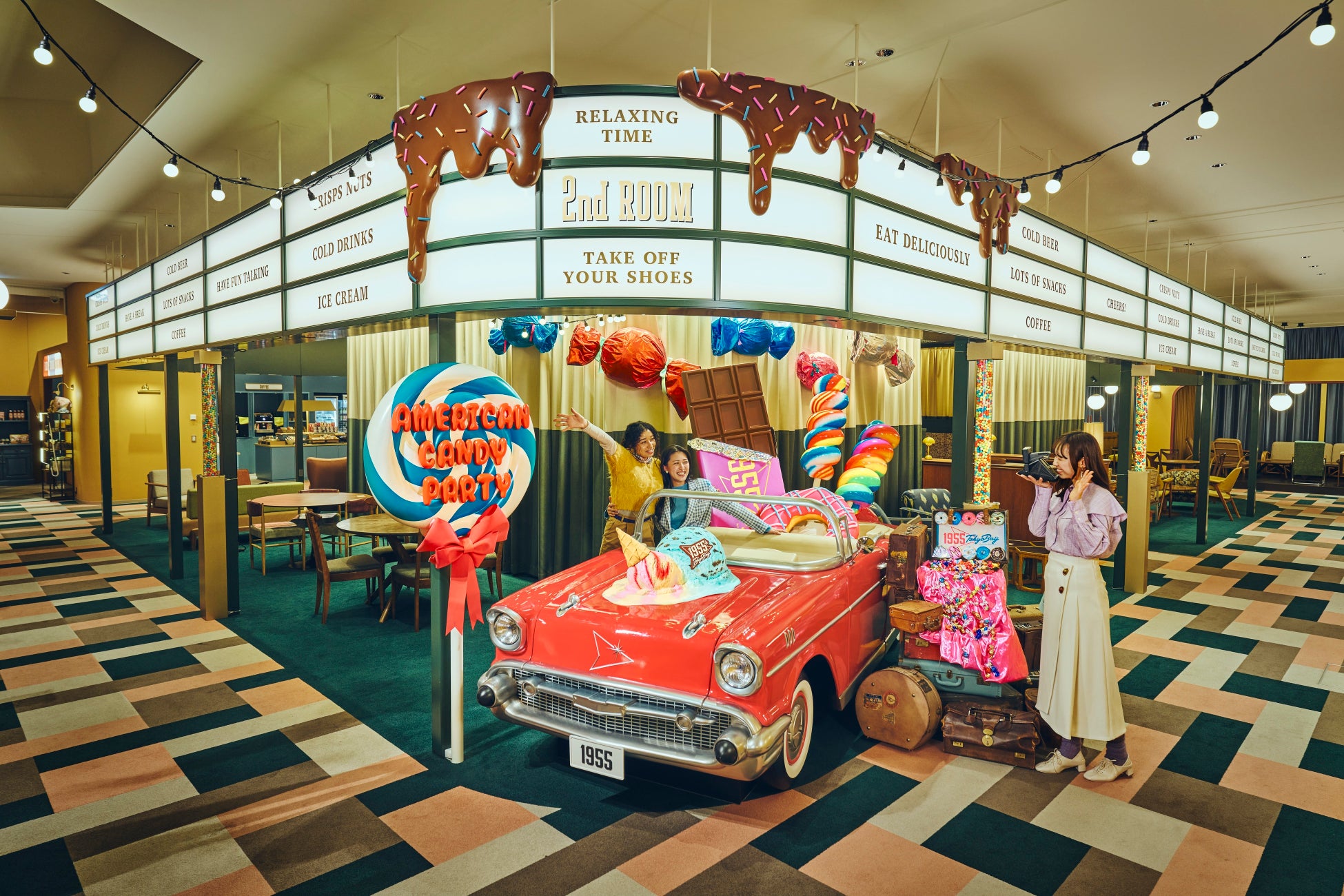 1955 東京ベイの館内は1955年頃のアメリカの世界観がモチーフ。1月15日~3月31日の期間は、カラフルでアメリカンなキャンディをテーマにした、「American Candy Party 1955」を開催しています。お菓子で彩られたパブリックスペースの「2nd Room」で仲間と一緒にたくさん写真を撮って、思い出を残すのがおすすめです。また、夜18時から営業する「Cafeteria」では、アメリカの9つの州にちなんだ9種類のメニューを仲間とシェアして楽しめる「Sweets Party Set」を提供します。各州に関するトークテーマのカードもセットになっているので、アメリカを旅する気分で仲間と食べて語って盛り上がれます。