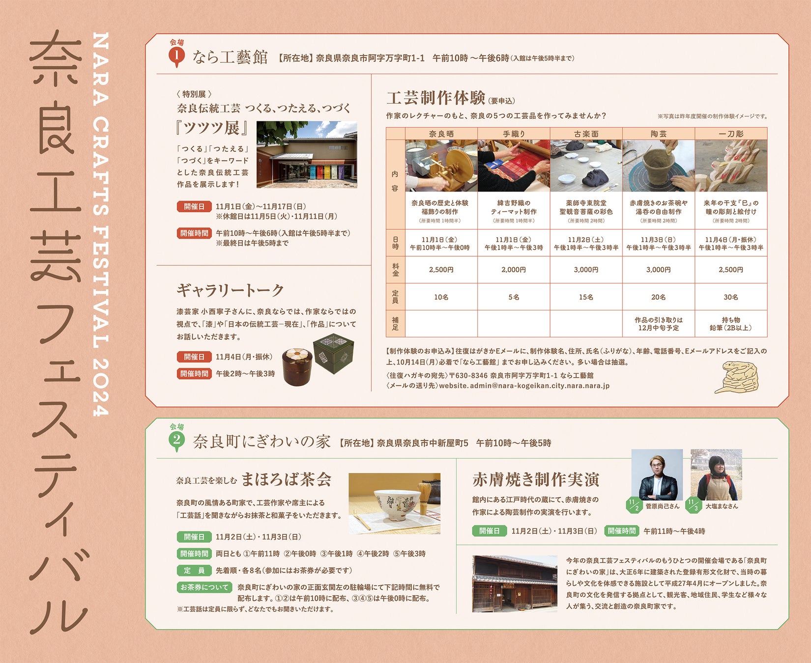 株式会社小学館集英社プロダクションが指定管理者として運営している「なら工藝館」と奈良町にある奈良市の公共施設「奈良町にぎわいの家」の2会場で、「奈良工芸フェスティバル2024」を開催します。