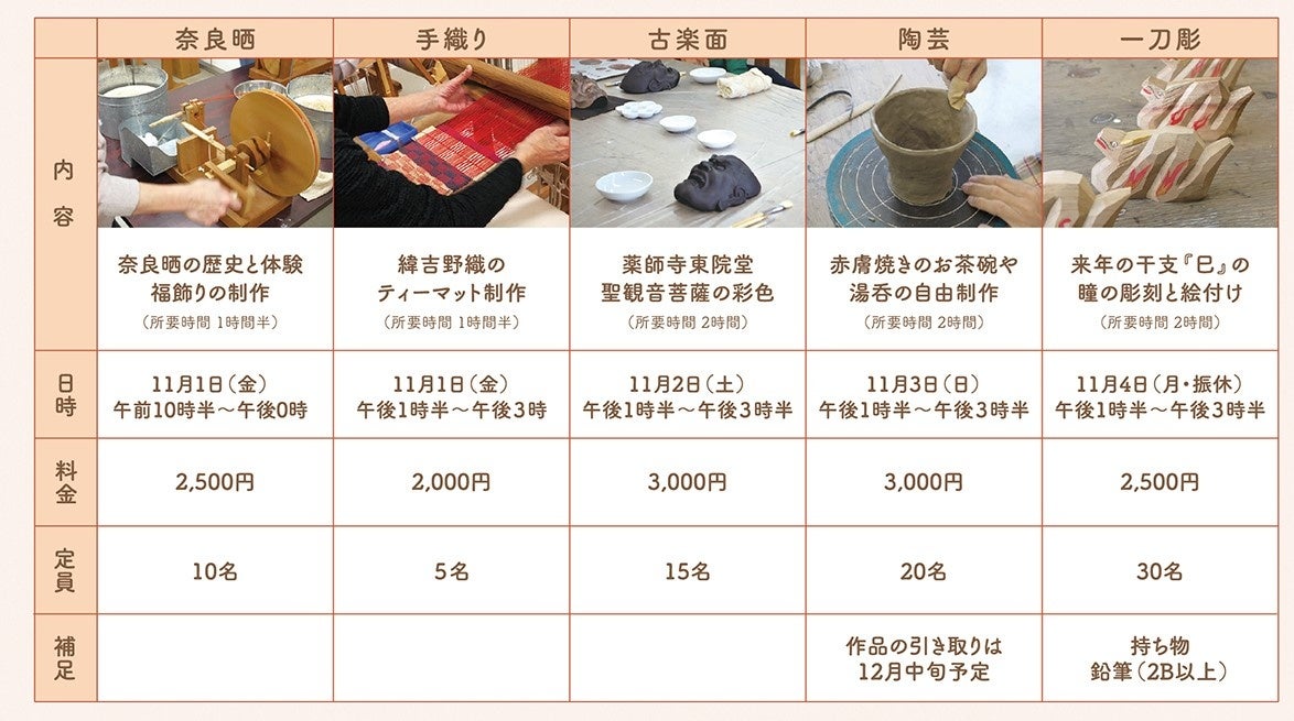 作家のレクチャーのもと、奈良の5つの工芸品を作ってみませんか?