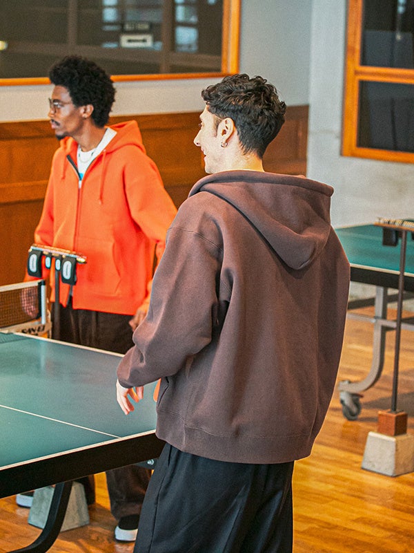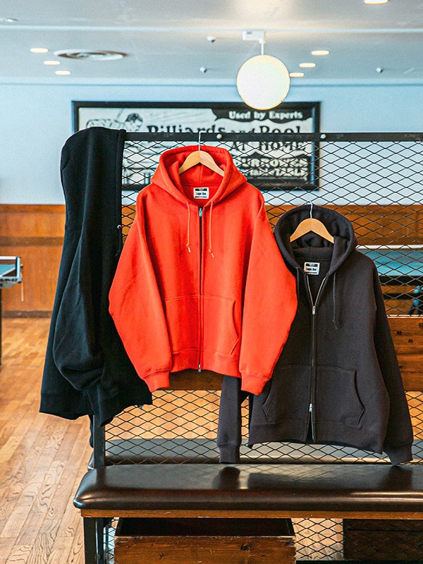 日本製の高品質なコットン素材を使用した、厚手ながらも柔らかくふっくらとした生地が特徴のジップアップフーディー。