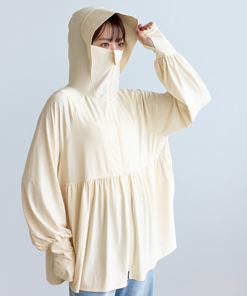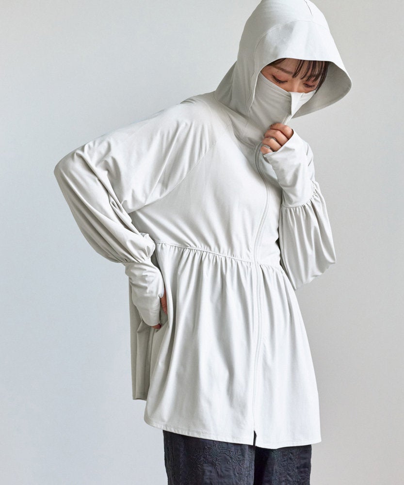 顔まわりから指先までしっかり肌を守ってくれるだけでなく、接触冷感機能を備えた素材を使用しているため、紫外線が気になる季節にも快適に着られる万能アイテムです。 つば付きのフードに加え、ファスナーを閉めることで鼻先まで覆うことができ、顔全体をしっかりカバーします。