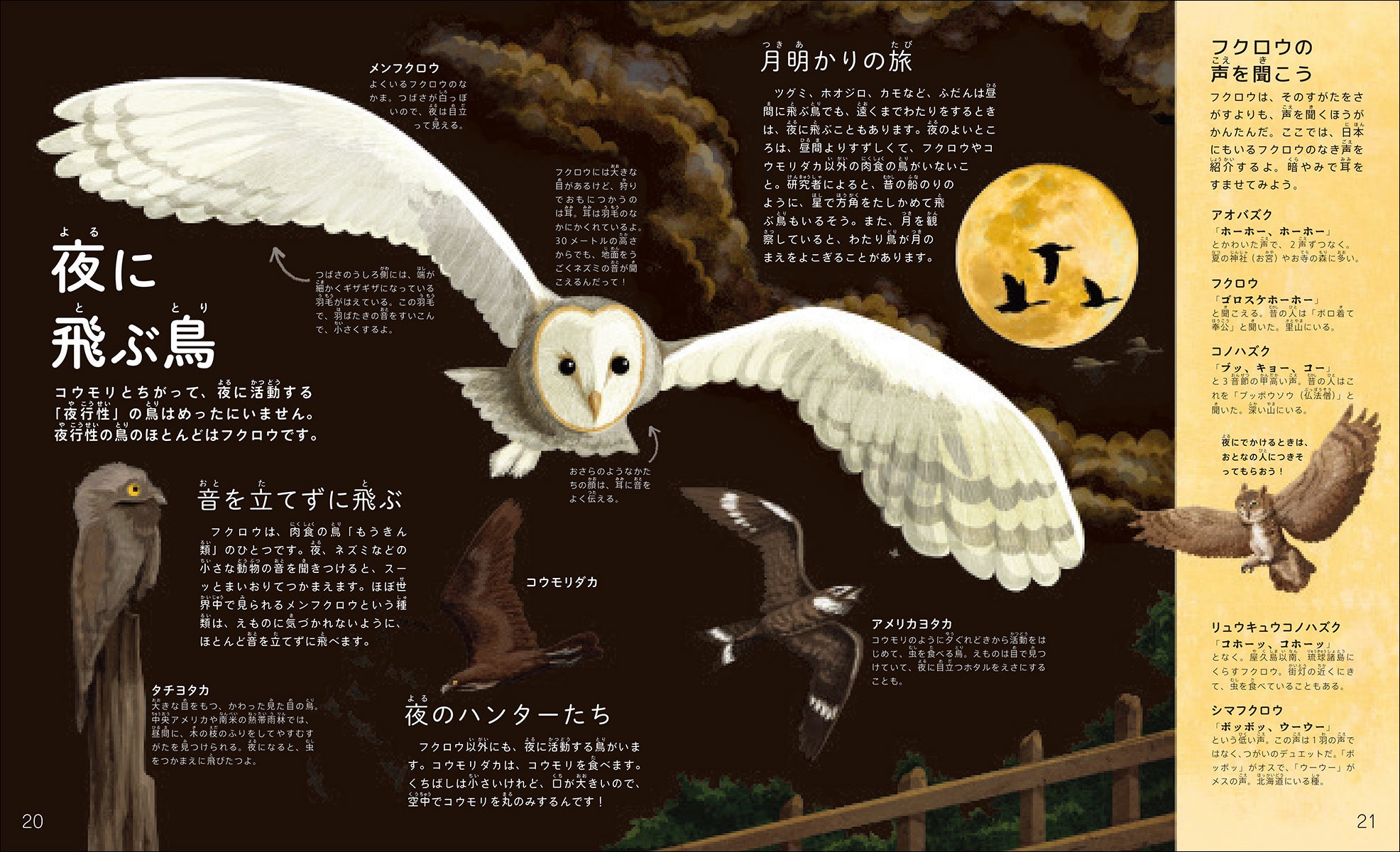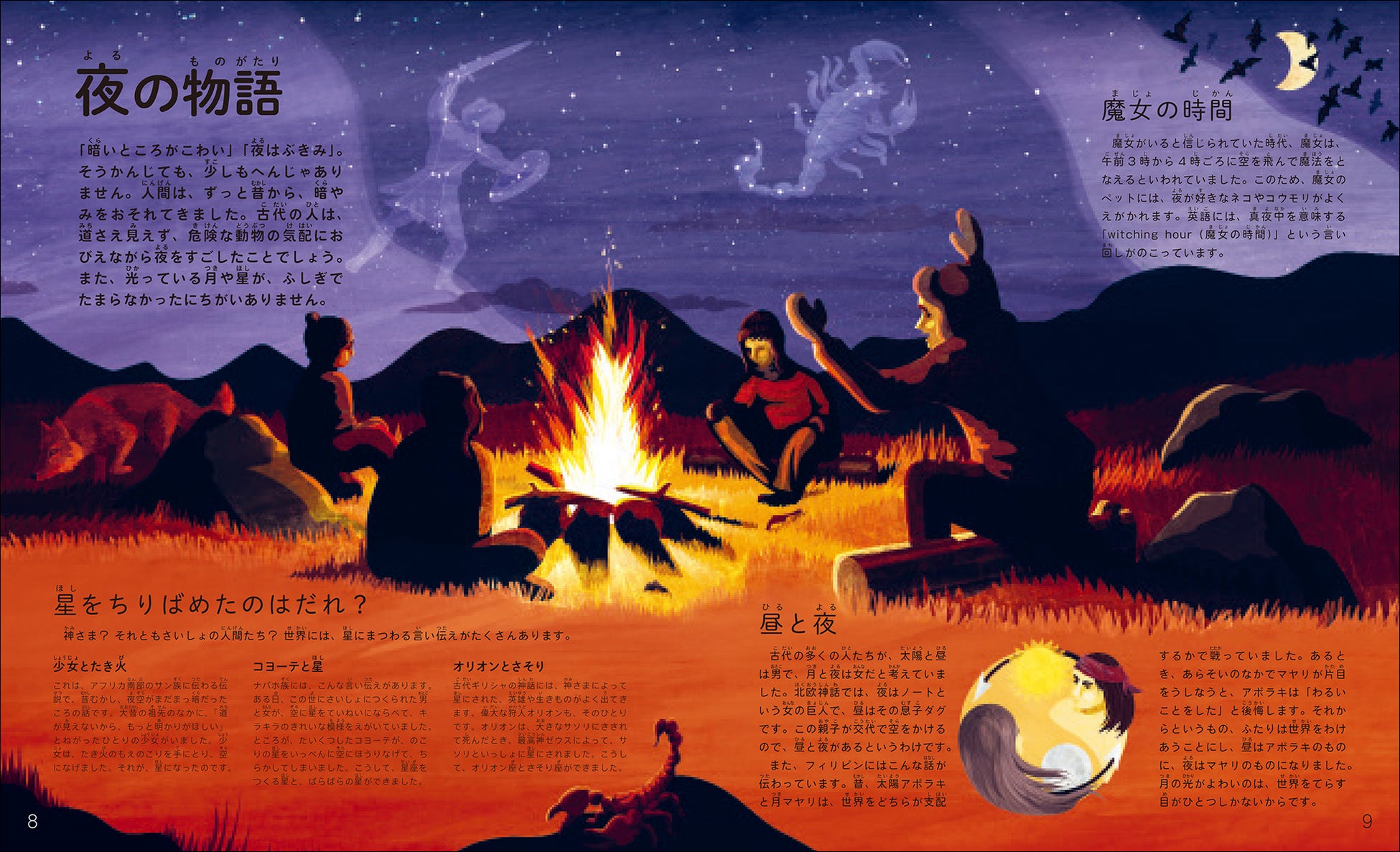 夜がきた/夜の空/夜の物語/星空/惑星/月/夜空のふしぎ/コウモリ/夜に飛ぶ鳥/夜の虫たち/ロケット/人工衛星/まちの明かり/オーロラ/夜明け