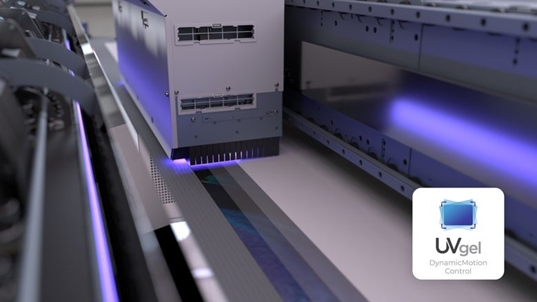 「UVgel FullBeam Curing」は、3.4m幅のLED硬化用ライトとミラーシステムを組み合わせ、印刷幅全体に均一なUV光を照射します。これにより、面積の大きいメディアでも高い均一性と広い色域の印刷が可能です。メディア搬送は新しい「UVgel TRIdriveバキュームベルトシステム」により最適化され、3つのローラーと複数のバキュームゾーンがメディアの位置を自動検出・修正し、蛇行やしわを軽減します。これにより、縦横ともに高精度な位置決めが可能となり、非常に精細な印刷を実現します。