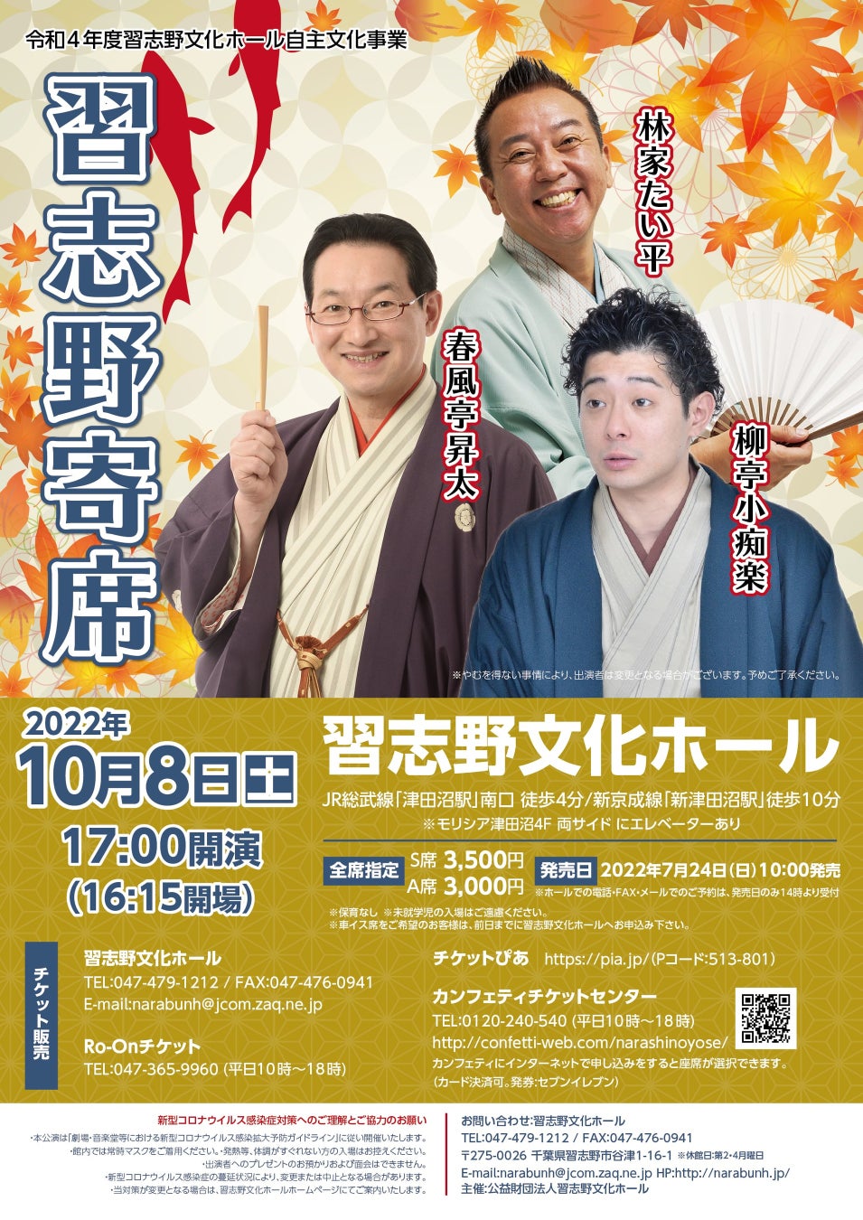 笑点の春風亭昇太・林家たい平と若手人気落語家 柳亭小痴楽が集結! 『習志野寄席』習志野文化ホールにて開催決定 カンフェティでチケット発売
