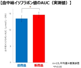 *旧商品は、大豆イソフラボン配糖体を主に配合し、イソフラボン類のうち、主にゲニステインやダイゼインの相対含有量が少なく、新商品は、大豆イソフラボン吸収型を配合し、主にゲニステインやダイゼインの相対含有量が多い組成。