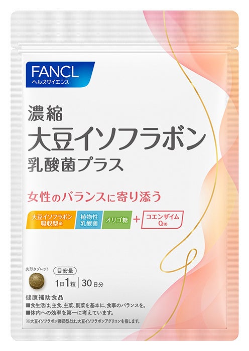 株式会社ファンケルは1月16日(木)から、「濃縮大豆イソフラボン 乳酸菌プラス」を通信販売と直営店舗、一般流通にて新発売します。同製品はそのまま吸収される形の「大豆イソフラボン吸収型※」や、「植物性乳酸菌」「オリゴ糖」「コエンザイムQ10」と4つの成分を配合。女性特有のバランスの変化と毎日の健康をサポートします。
