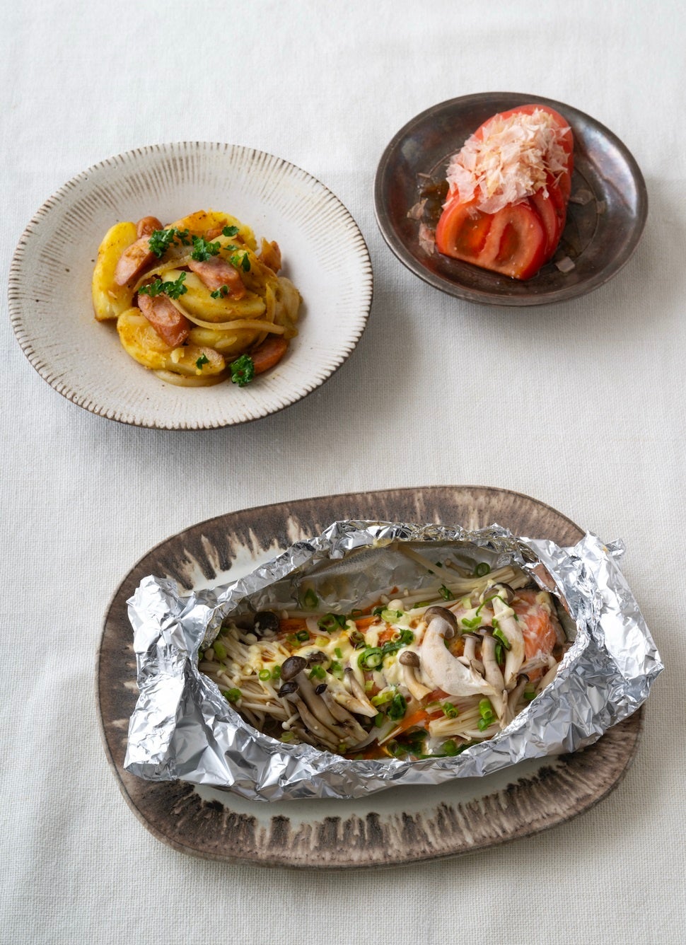 鮭の切り身と野菜を包んで焼くだけ。1人分ずつ包むから、家族の帰りがバラバラな日にも便利。
