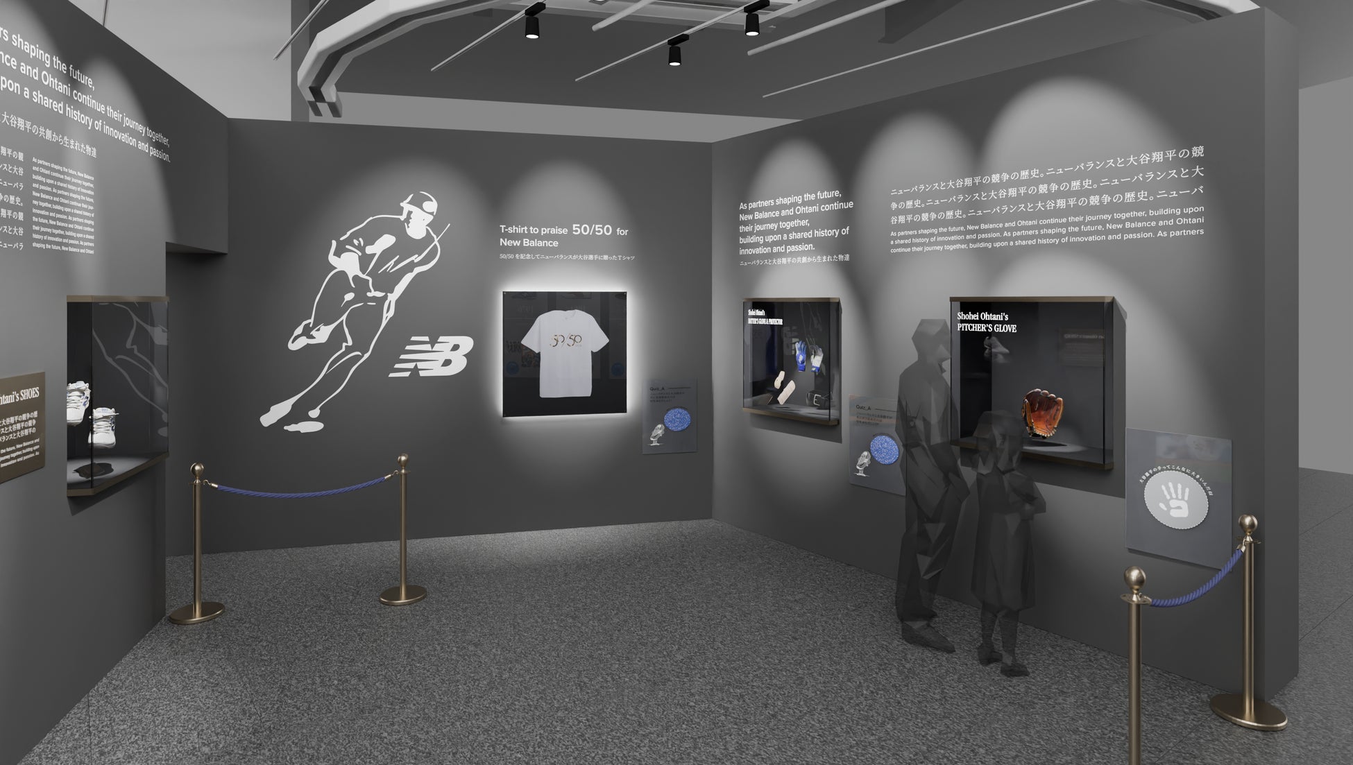 ニューバランスと大谷翔平選手の出会いからともに創り上げてきた軌跡を実物のプロダクト展示とともに振り返るギャラリー。