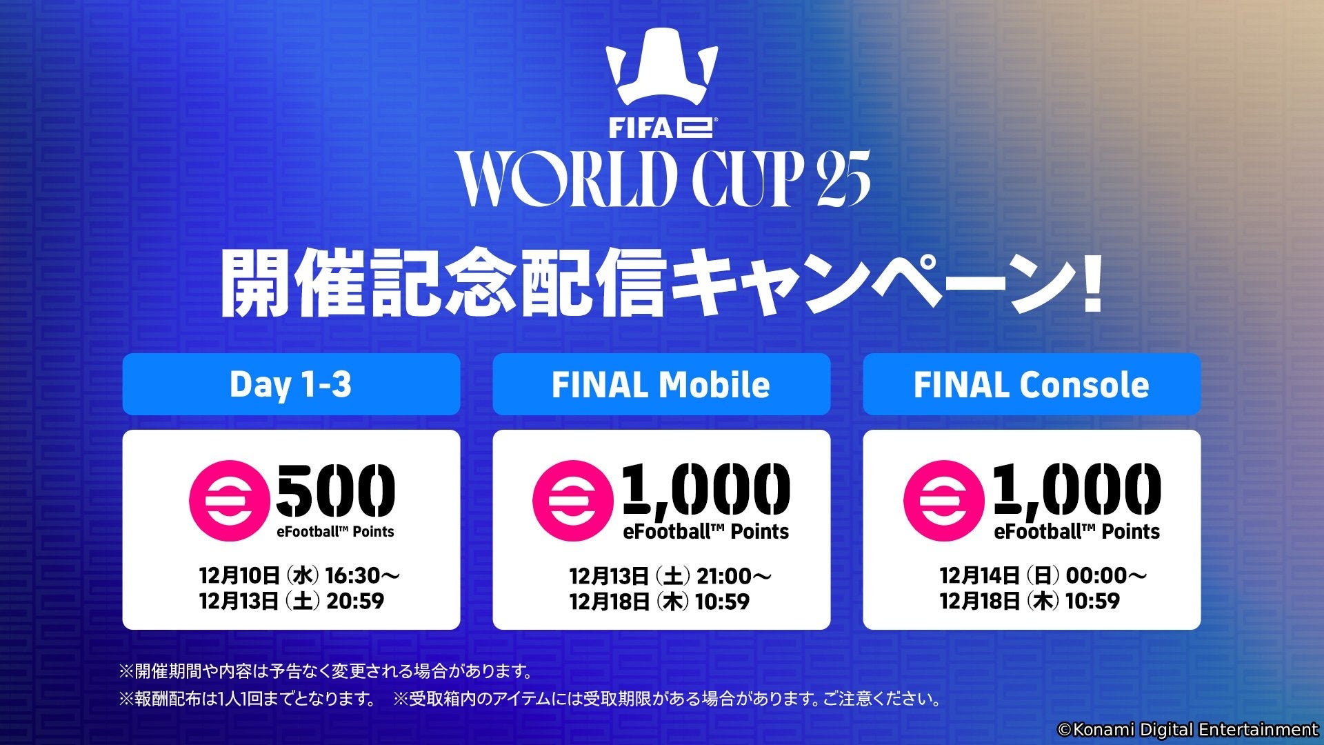株式会社コナミデジタルエンタテインメント(以下、KONAMI)は、基本プレー無料で家庭用ゲーム機、PC、モバイルで配信中の『eFootball™』が競技タイトルとして採用されている、eスポーツ世界大会「FIFAe World Cup 2025™」が12月10日(水)にサウジアラビア・リヤドで開幕することをお知らせします。また、『eFootball™』では、開幕を記念したキャンペーンを本日12月4日(木)から開催中です。