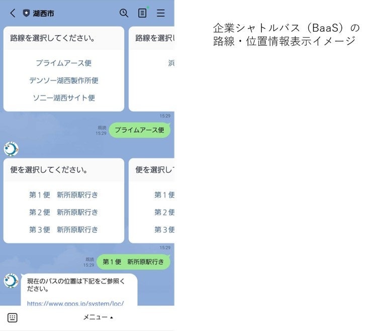 湖西市では、2021年12月2日から市内企業の協力のもと新たな市民の移動手段として、企業シャトルバス運行の実証実験を開始、2022年1月25日をもって新型コロナウイルスの変異型「オミクロン株」による感染急拡大を受け、感染拡大防止の観点から中止となりましたが、今回のリニューアルで「DEC Connect」の外部システム連携機能を活用し、LINE上に路線情報や位置情報の表示を予定していました。