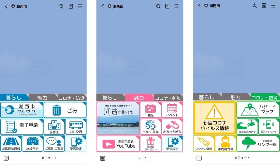 タブで3つのメニュー画面を切り替え表示することが可能となり、より多くの情報にリッチメニュー上からすばやくアクセスできるようになりました。