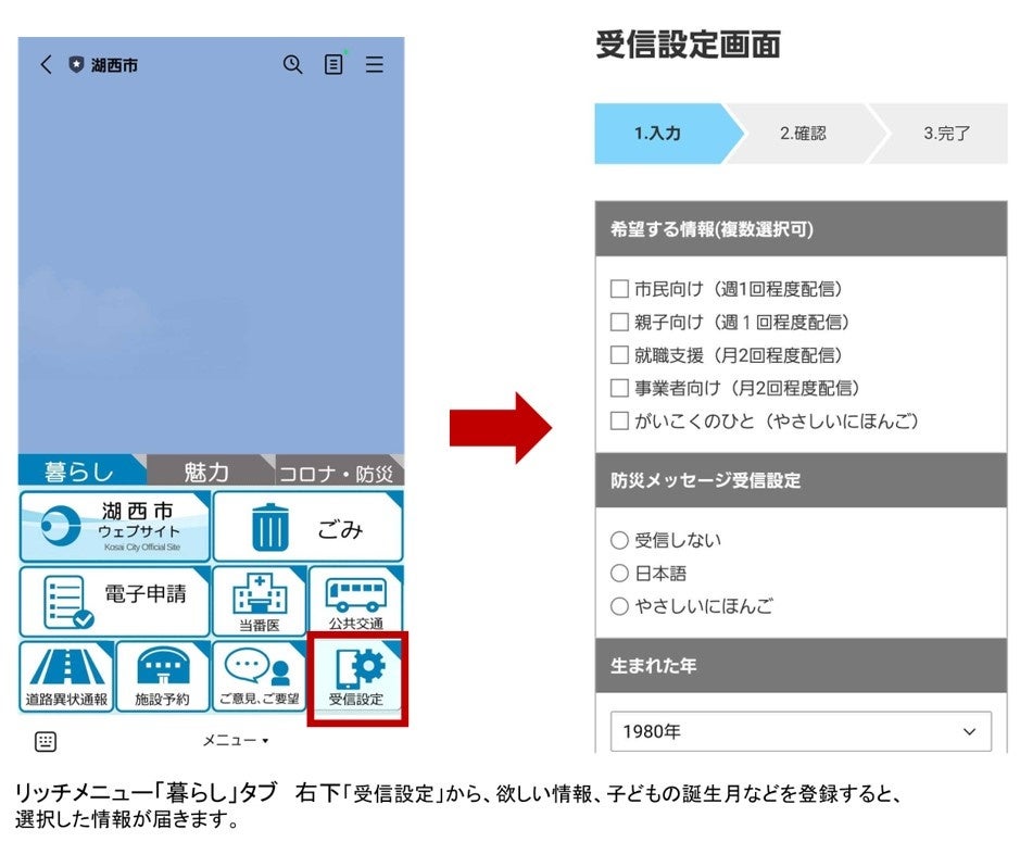 市政情報や、親子向け情報、災害・防災情報、事業者向けなど、受け取りたいジャンルの情報を選択すると定期的に情報が配信されます。