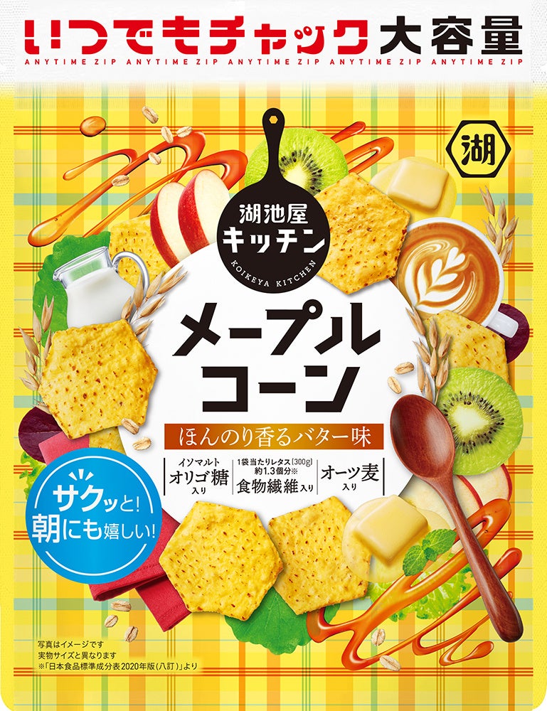 湖池屋キッチンからの新提案!心ほっこり満たされる、サクッと朝にも嬉しい一枚。「いつでもチャック メープルコーン ほんのり香るバター味」