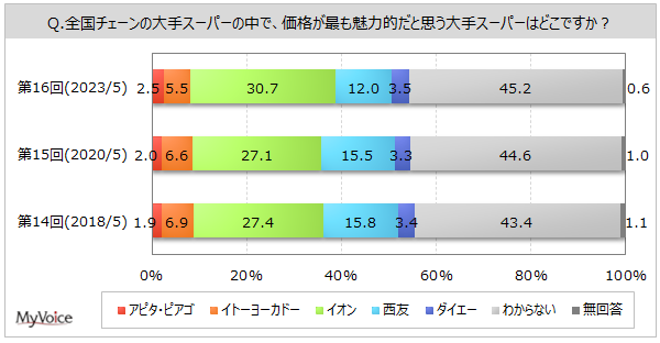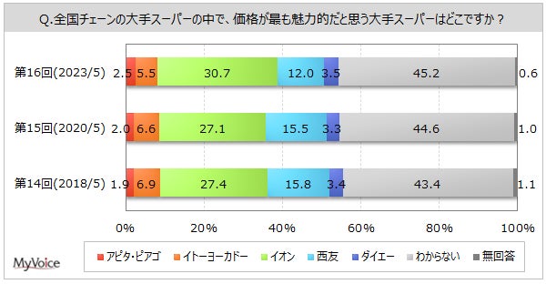 【大手スーパーのブランドイメージに関する調査】『価格が最も魅力的だ』と思う大手スーパーは、「イオン」が3割強、「西友」が1割強。他のイメージ項目に比べて、「西友」の比率高い