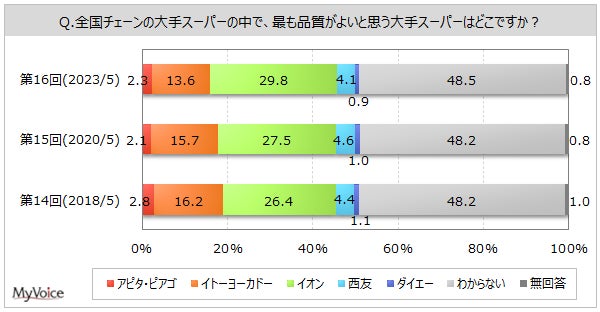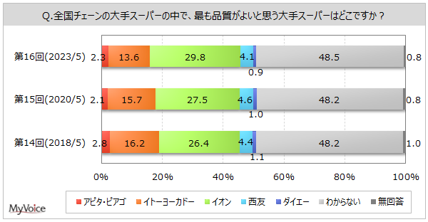 最も品質がよいと思う大手スーパーは、「イオン」が29.8%、「イトーヨーカドー」が13.6%です。「わからない」が48.5%みられます。関東では「イトーヨーカドー」、北陸や中部では「アピタ・ピアゴ」が他の地域よりやや高くなっています。