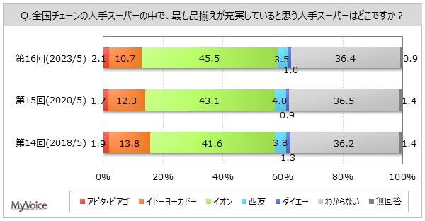 最も品揃えが充実していると思う大手スーパーは、「イオン」が45.5%、「イトーヨーカドー」が10.7%です。最頻利用スーパーが最も品揃えが充実していると回答した人は、『イオン』主利用者で7割弱みられます。『ダイエー』『西友』主利用者では、主利用スーパーより「イオン」を選ぶ人の方が多くなっています。