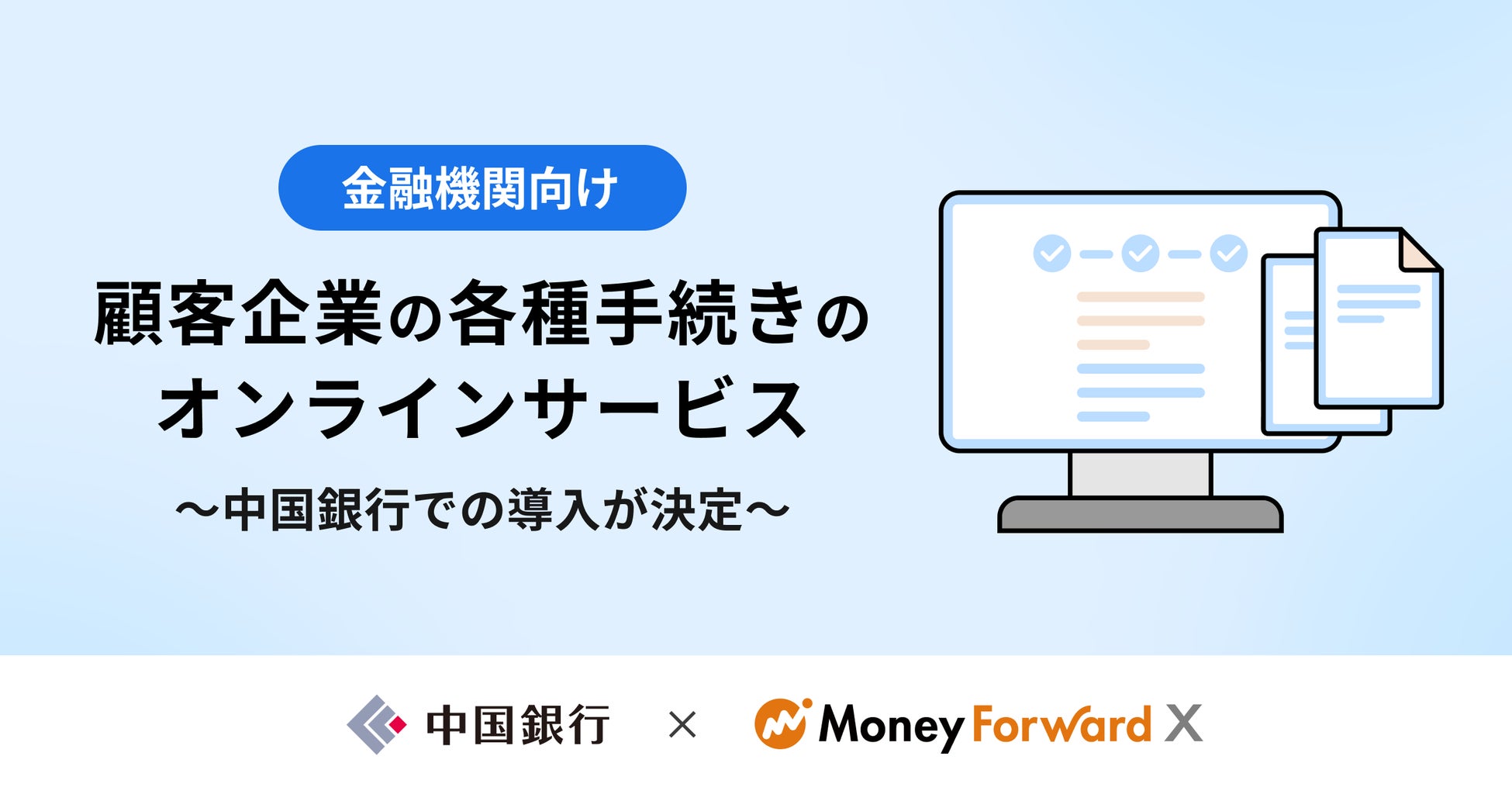 株式会社マネーフォワードの金融機関向けサービスを開発する部門「Money Forward X」は、金融機関と顧客企業(法人および個人事業主)間の各種手続きをオンラインで行えるサービス(以下、本サービス)の開発を開始しました。本サービスの最初の導入行は株式会社中国銀行で、2025年春頃にサービスを開始予定です。