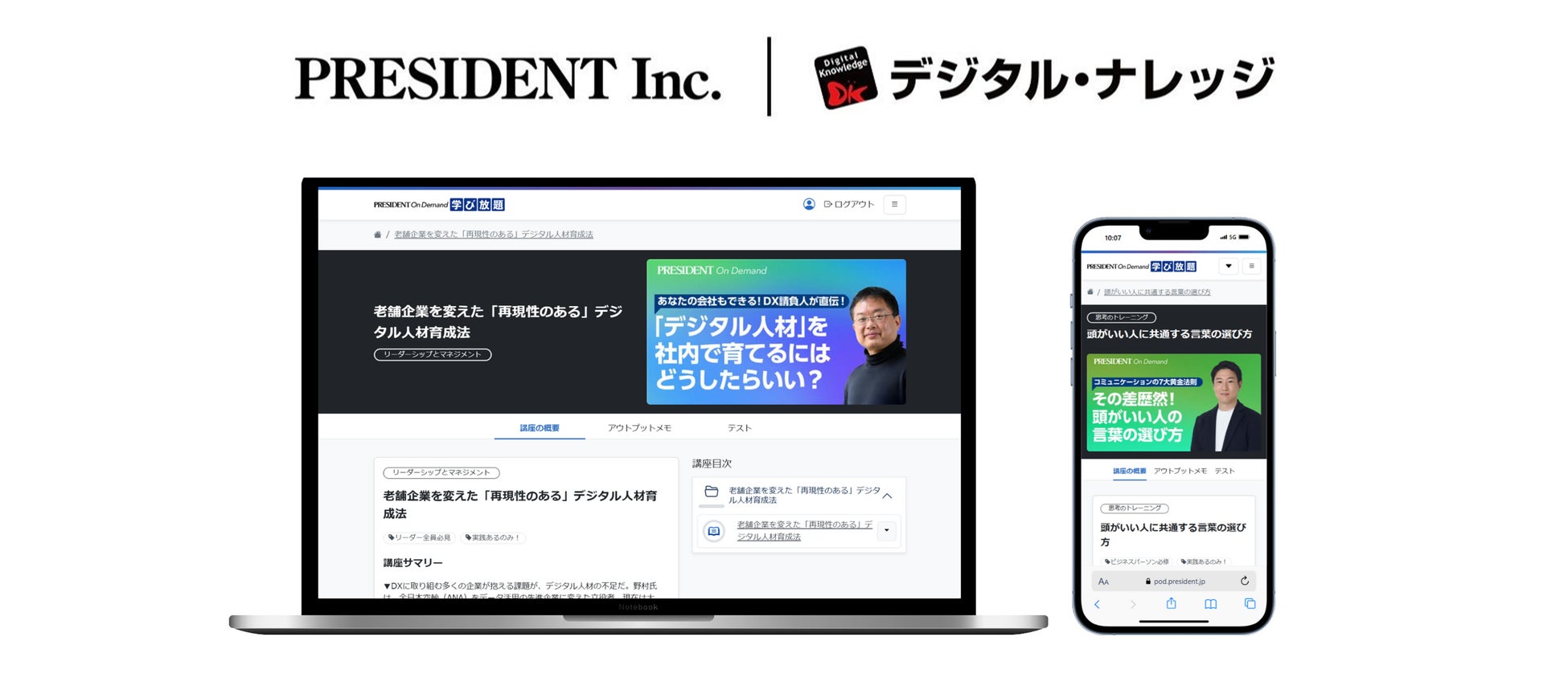 導入実績3,000超を誇るeラーニング専門ソリューション企業、株式会社デジタル・ナレッジ(本社:東京都台東区、代表取締役社長:はが弘明)は、株式会社プレジデント社(本社:東京都千代田区、代表取締役社長:鈴木勝彦 以下、プレジデント社)との協業により、企業の経営課題解決と人材育成を支援する、法人対応の定額制動画学習サービス「プレジデントオンデマンド学び放題」を2025年4月より提供しております。