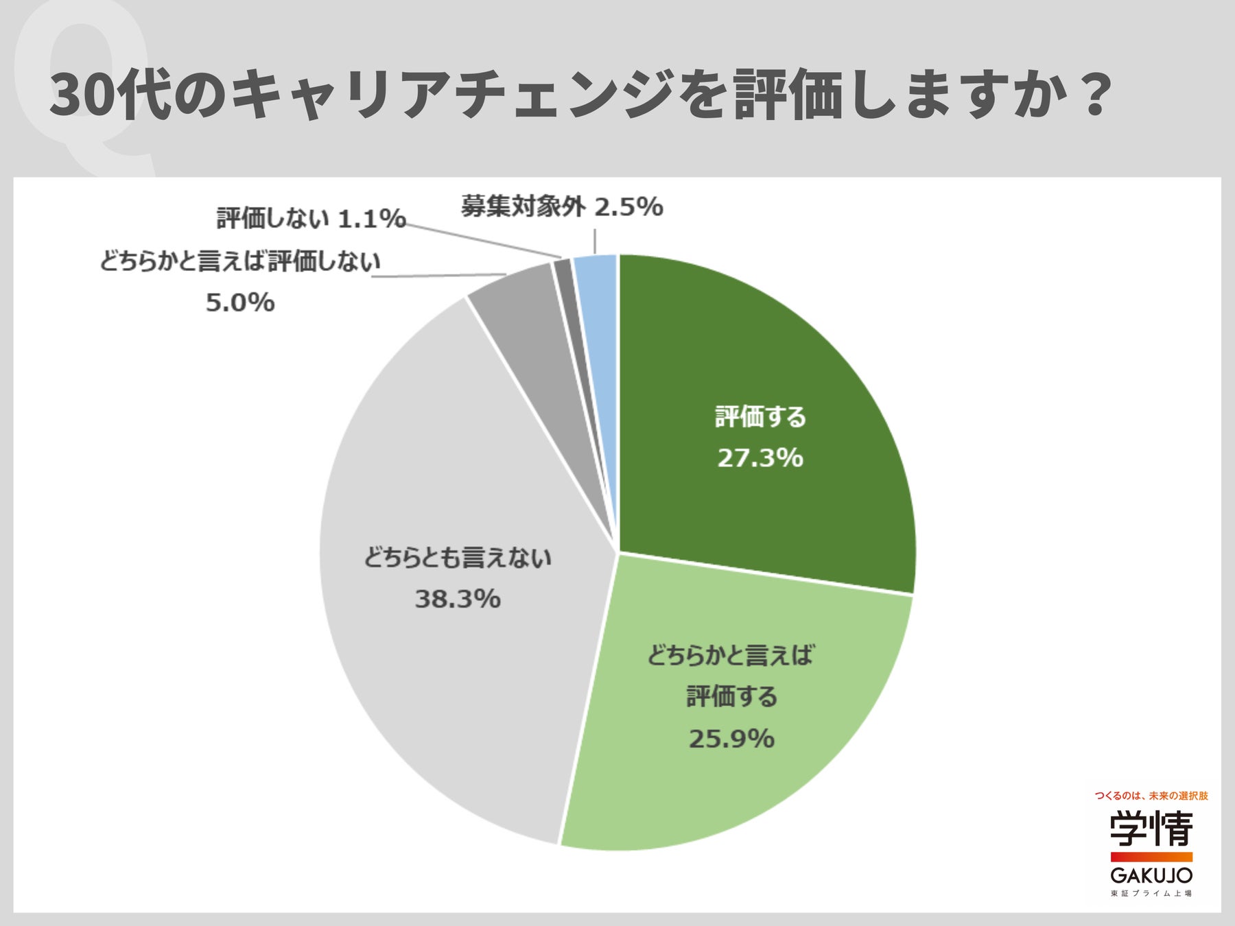 30代のキャリアチェンジについて、「評価する」と回答した企業が27.3%に上りました。「どちらかと言えば評価する」25.9%を合わせると、半数以上の企業が「30代のキャリアチェンジを評価する」としています。「新たな世界に飛び込もうとするチャレンジ精神や積極性を持っている方として、高く評価する」「実際に多くの業界未経験者を採用しているが、その入社者が会社に大きく貢献してくれている」「異業種の経験者を採用することで、自社に新たな風をもたらしてくれると思う」などの声が上がりました。