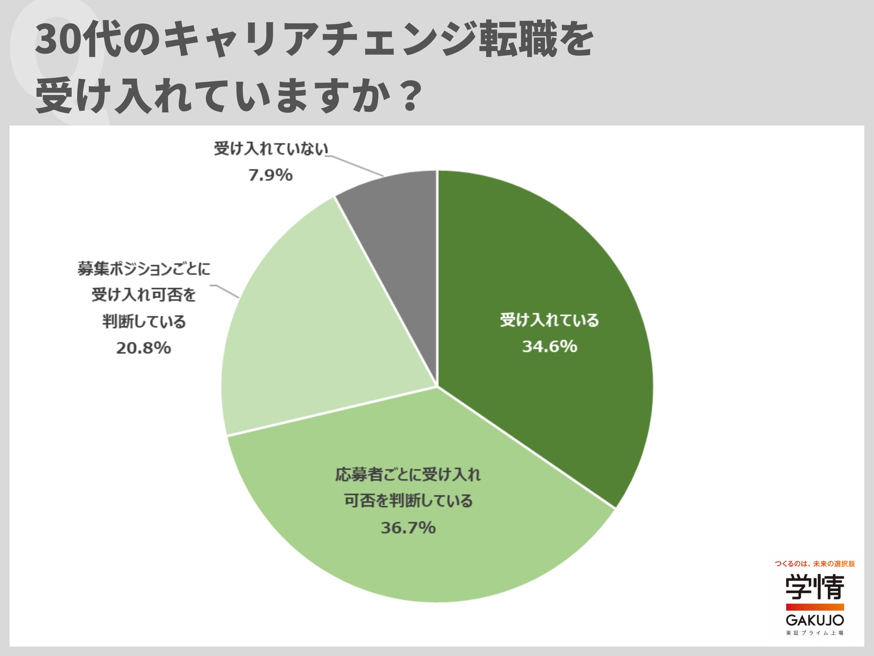 株式会社学情(本社:東京都中央区)は、企業・団体の人事担当者を対象に、インターネットアンケートを実施。今回は、「30代のキャリアチェンジ」について調査しました。30代のキャリアチェンジ転職について、3社に1社の企業が「受け入れている」と回答しました。その他の企業も、応募者ごとやポジションごとに受け入れ可否を判断しており、30代のキャリアチェンジ転職を全く受け入れていない企業は1割未満にとどまりました。また、30代のキャリアチェンジを「評価する」と回答した企業が半数以上に上りました。「新たな世界に飛び込もうとするチャレンジ精神や積極性を持っている方として、高く評価する」「実際に多くの業界未経験者を採用しているが、その入社者が会社に大きく貢献してくれている」「異業種の経験者を採用することで、自社に新たな風をもたらしてくれると思う」などの声が上がりました。