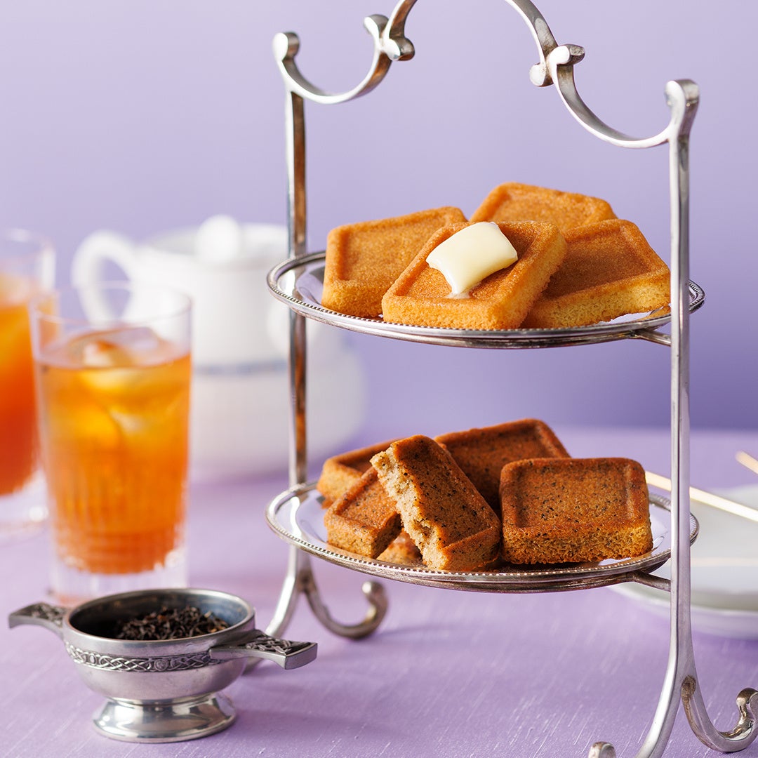 ヨーロッパ産発酵バターとアールグレイ茶葉を生地に練り込んだ、バターとベルガモットの華やかな香り漂うフィナンシェでございます。今回の発売より、イメージカラーを“ロイヤルブルー”に一新したパッケージ。上品な味わいをより印象づける、洗練された新しい装いにもご注目ください。