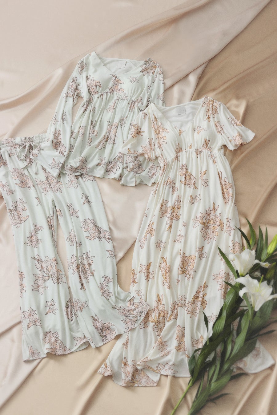 リリーモチーフプルオーバー ¥6,380 / リリーモチーフロングパンツ ¥6,820 / リリーモチーフドレス ¥8,910