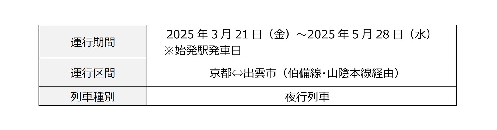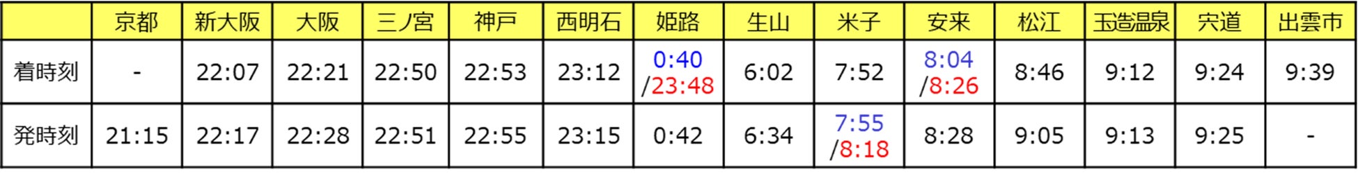 ※姫路・米子・安来の3駅は運転日によって時刻が異なります(月曜日始発となる列車/金曜日始発となる列車)
