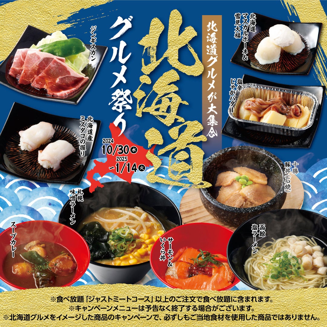 ワタミ株式会社(東京都大田区、以下ワタミ)と国内有数の和牛生産者であるカミチクグループ(鹿児島県鹿児島市)との合弁会社、ワタミカミチク株式会社(東京都大田区、以下ワタミカミチク)が展開する「かみむら牧場」は、2024年10月30日(水)から2025年1月14日(火)まで期間限定で、「北海道グルメ祭り」としてバラエティ豊かな9種の北海道を代表するメニューが「ジャストミートコース」以上の食べ放題コースで提供いたします。