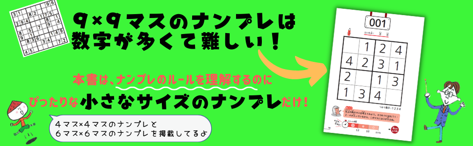 「ナンプレ」は9×9マスの81マスに数字を書き込んでいくパズルです。本書は小学校入学準備~小学校低学年の子どもを対象に、その入門書として4×4マスや6×6マスのナンプレを用意したパズル問題集。「考える力」がつくナンプレで算数の学習に必要な思考力が育ち、自分の力で1冊解ける達成感から自信もつく一冊です。