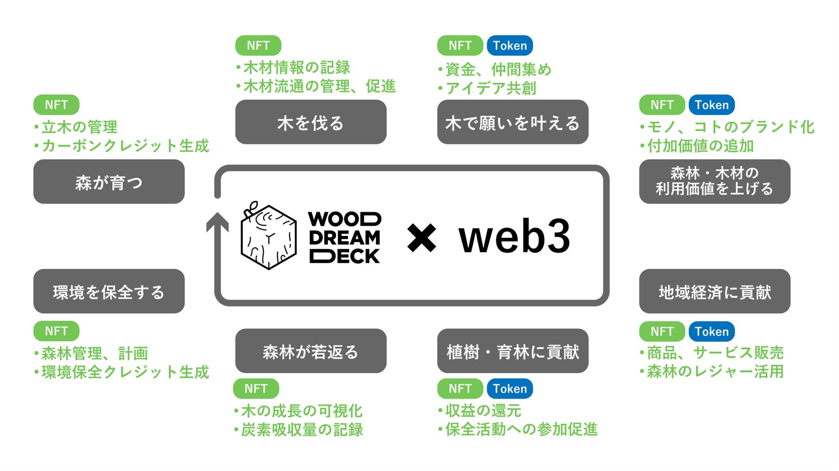「WOOD DREAM DECK」は、「木を使ってしたいこと」を持つ人の願いを叶える支援を通して、地域の森林資源の価値を高めて循環利用を促進し、「都市集中・地方衰退」「低・脱炭素化」の解決を目指すプログラムです。今後、web3技術を用いて以下3つの観点から支援していきます。