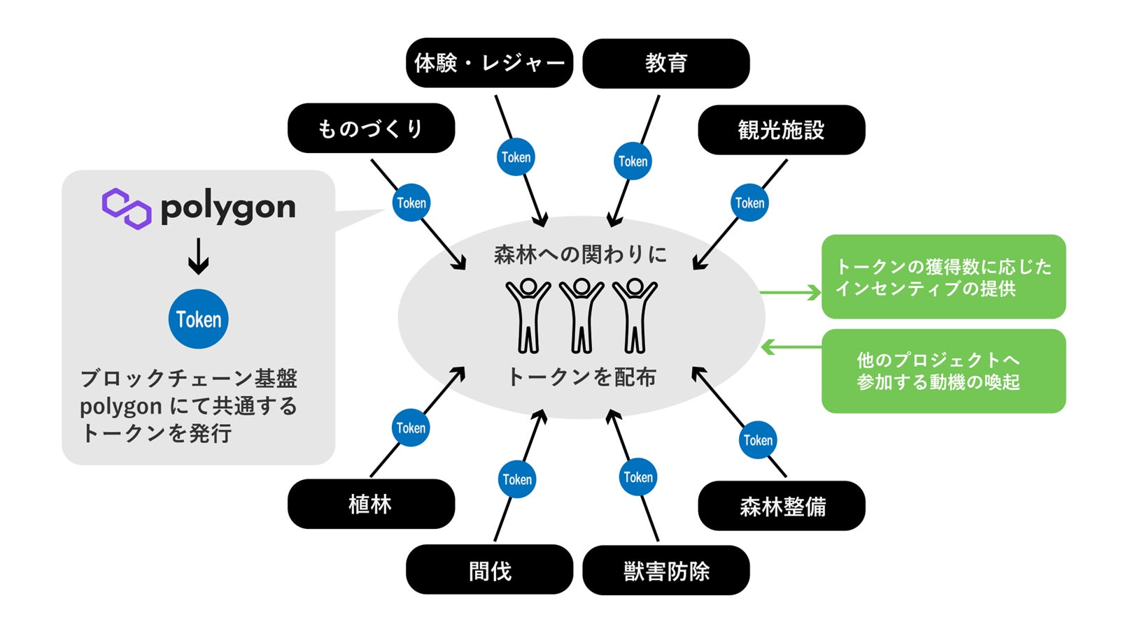 分散型web3を活用したトークンは、中央集権的なプラットフォームに依存しない特徴から、領域を超えた価値交換の基盤として優れています。そこで、ファンベースコミュニティを広げるために、森林関連のトークンを発行し流通させることで、様々なインセンティブを与えて地域内外の人があらゆる森林関連のプロジェクトに参加するきっかけを生み出し、コミュニティを活性化させます。