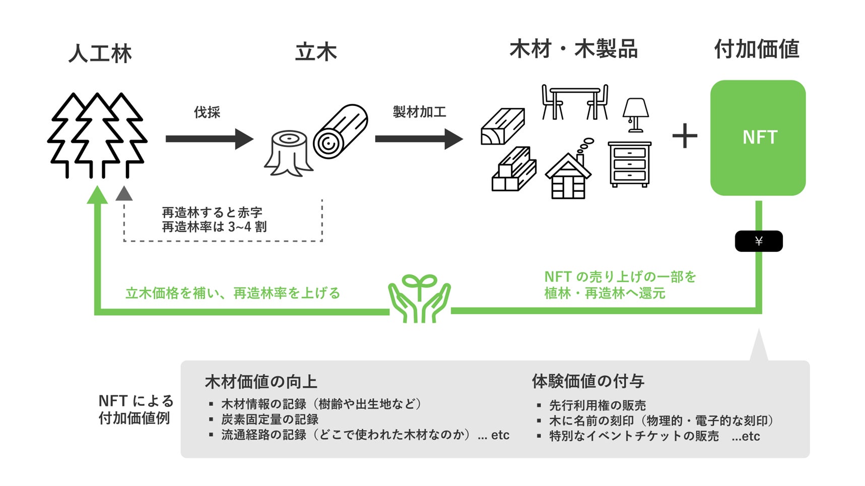 日本の森林にある立木は、海外からの輸入材の価格競争などに影響を受け非常に安値で取引されており、山主が立木を売っても植樹や再造林をすると赤字になるため、伐採後は3~4割程度しか再造林されていません。この状況を打開するため、地域の木材を使った製品や体験にNFTを活用して付加価値をつけることで、木の需要を生み出し末端価格を高める仕組みづくりを目指します。具体例としては、NFTで木の情報やメッセージを記録したり、利用・所有の権利やイベントへの参加資格を付与したりします。これにより、追加で得た利益を植樹や再造林の費用に還元できるようにします。