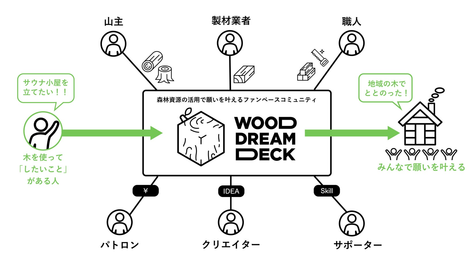 未利用間伐材や遊休森林などの森林資源活用に必要な地域の山主、製材業者、家具職人などと、森林に関わる地域内外の様々なプロジェクトや個人を繋げるファンベースコミュニティを提供し、web3技術を使って活性化させます。木を使ってしたいことのアイデアを出し合い、それを技術的に実現する職人や林業関係者、サポートや金銭的支援をしてくれる地域内外の人をつなげることで、したいことの実現を支援します。