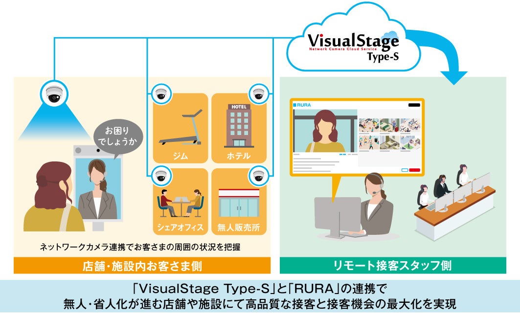 キヤノンマーケティングジャパン株式会社(代表取締役社長:足立正親、以下キヤノンMJ)は、クラウド型録画サービス「VisualStage Type-S」と、タイムリープ株式会社(代表取締役社長:望月亮輔、以下タイムリープ)が提供する遠隔接客サービス「RURA」の連携を2025年10月9日より開始します。本連携により、店内や施設に設置された複数のカメラ映像を活用し、リモート接客スタッフがより広い視野でお客さまや現場の状況を把握できます。これにより、お客さまへの対応漏れを防ぎ、高品質な接客と接客機会の最大化を実現するとともに、店舗運営の効率化や業務負担の軽減を支援します。